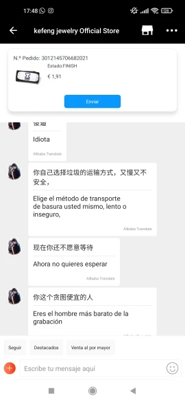Я покупаю на AliExpress в течение многих лет и отлично, пока не куплю у этого продавца. Я не рекомендую это, если у вас есть какие-либо проблемы с заказом, вместо того, чтобы помочь вам, он высмеивает вас и оскорбляет вас, Я оставляю вам скриншот разговора, в котором он оскорбил меня и ни за что не помог мне с проблемой. Если вам нравится этот товар, купите его у другого продавца.