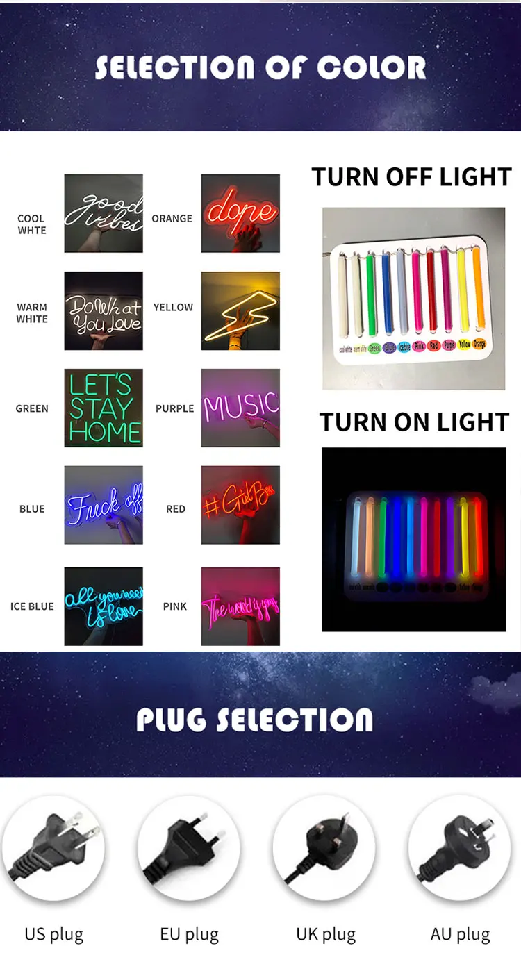 1. Мы можем сделать все неоновые знаки, которые вам нужны.Просто предоставьте содержание, цвет, размер или отправьте нам чертежи вашего дизайна и детальные требования2. Настенный монтаж, Установка Подвески, простой и удобныйИспользуйте провод, чтобы повесить сверху знак или прикрутить к стене3. Стандартная вилка для любой страныЕсть штепсельная вилка стандарта США, штепсельная вилка стандарта Великобритании, штепсельная вилка стандарта Австралии и штепсельная вилка европейского стандарта4. Один год гарантии на светодиодную неоновую вывескуНаша светодиодная неоновая вывеска сделана из лучшего качества led neon flex, поэтому мы можем обещать, что наружная гарантия составляет 6 месяцев, гарантия в помещении составляет 1 год. В течение гарантийного срока, если возникнут какие-либо проблемы с качеством, мы отремонтируем или даже заменим для вас бесплатно.5. Заводская ценаПотому что мы производим в Фошань, поэтому, когда мы обеспечиваем лучшее качество продукции для вас, мы также можем дать вам самую разумную цену.6. Короткое производство и время доставкиУ нас есть более 100 рабочих фабрик, и долгосрочные отношения с транспортной компанией. Поэтому мы можем обещать вам короткое производство и время доставки. Обычно это занимает 4-5 рабочих дней для производства, экспресс-доставка около 30-90 дней, коммерческий Экспресс-Доставка 5-7 дней