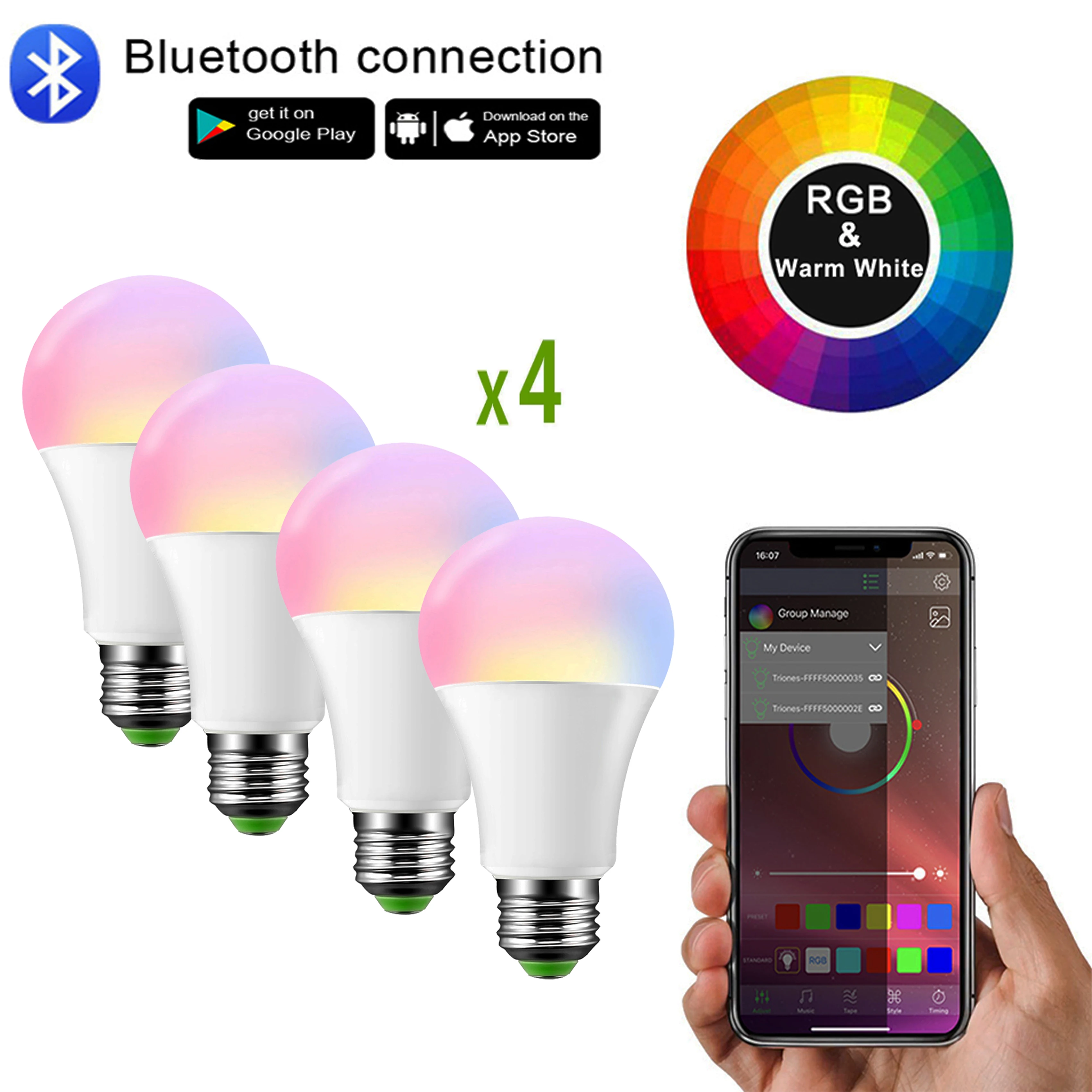 Умная лампа, 4 шт., с Bluetooth, E27, цветной светильник, 15 Вт, с регулируемой яркостью, RGB, светодиодная лампа, управление с помощью приложения, синхронизация с музыкой, для дома