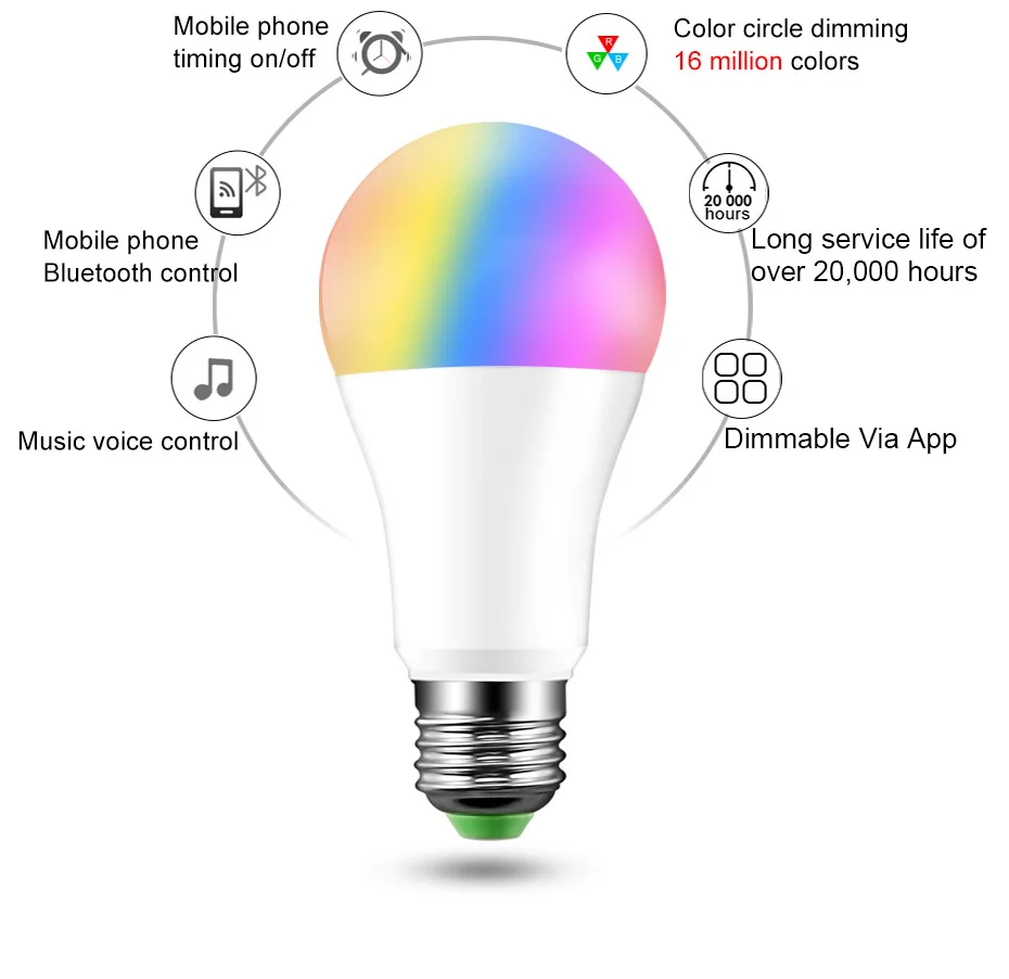 Это умная лампа bluetooth, которая сочетает в себе повседневное освещение с насыщенным цветом света. Простота в эксплуатации, регулируемая яркость, подходит для различных применений. Он оснащен лампой накаливания 2700K, 1275 люмен, CRI> 85RA, может заменить стандартную лампу накаливания 60 Вт. Шестнадцать миллионов цветов, музыкальные ритмы, несколько режимов.# Не используйте переключатели диммера