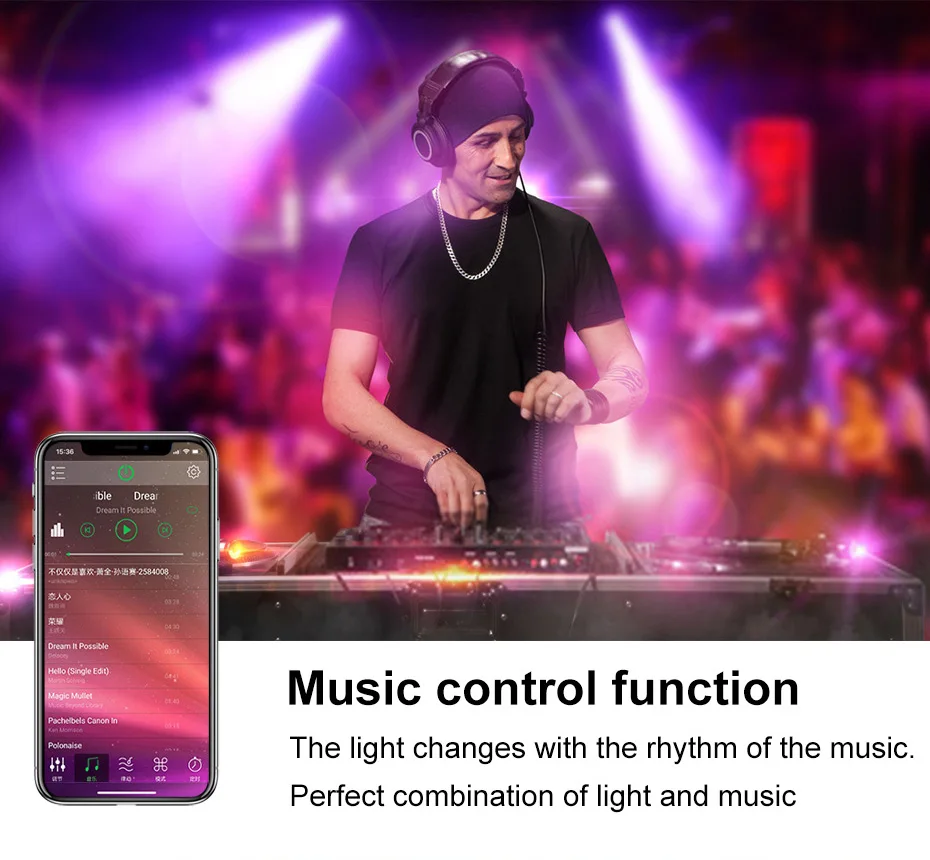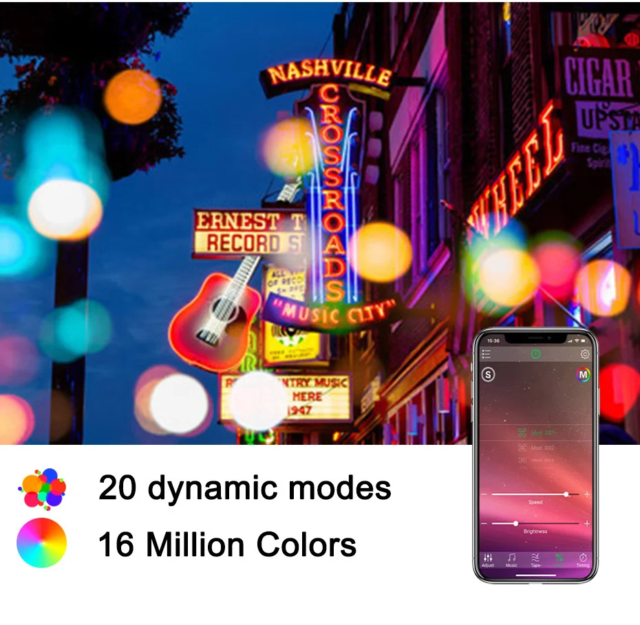 Музыкальный ритм и богатые узоры:Цветные лампочки могут активировать функцию «Музыкальный ритм» в приложении для телефона и сделать светильник «танцевать» музыкой. На энергивечерние Сочетание освещения и музыки полностью мобилизует зрение и слух, делая счастье трехмерным. Вы также можете настроить различные режимы и скорости, и у вас есть последнее слово о том, как перетекает цвет освещения.