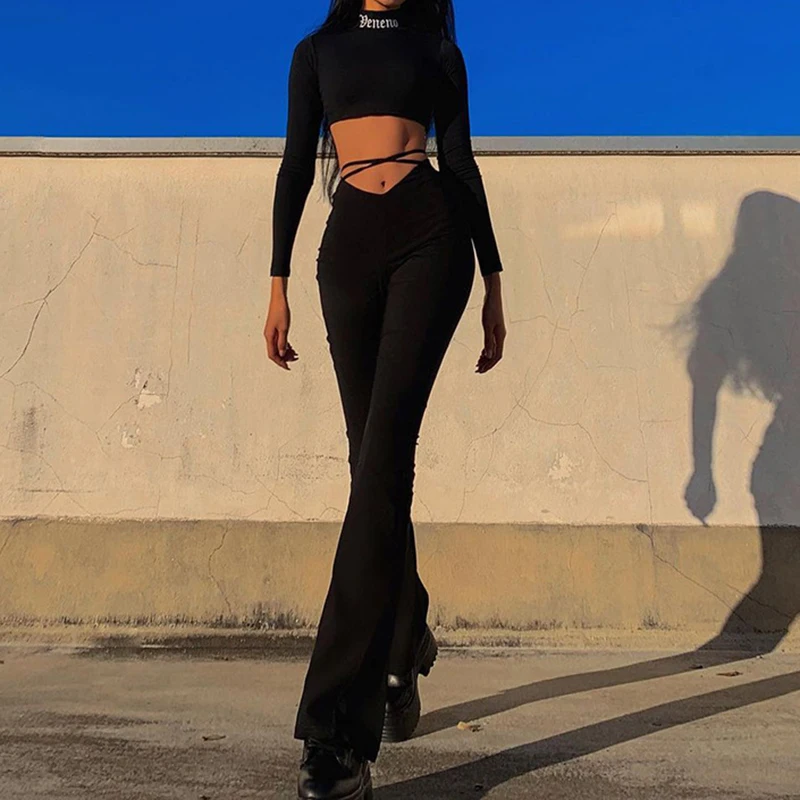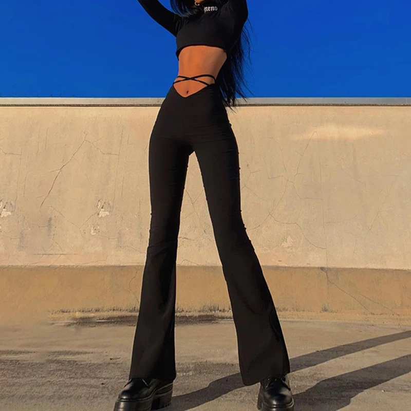 Женские брюки-клеш ADEAST Cyber Y2k, черные, со шнуровкой и V-образ...