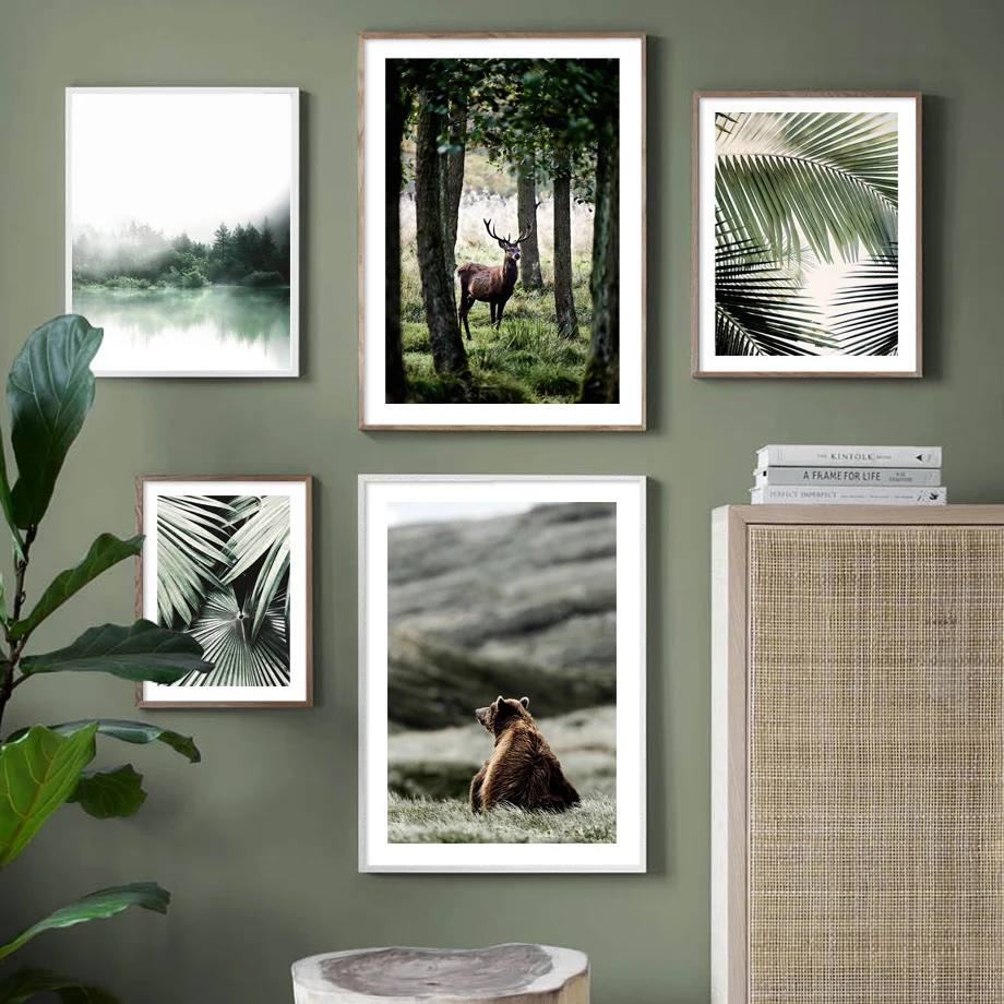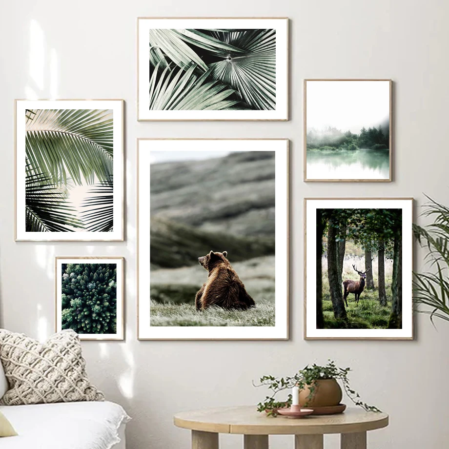 Медведь Олень лес озеро туман Тропическое растение Настенная живопись холст скандинавские плакаты и принты настенные картинки для декора гостиной