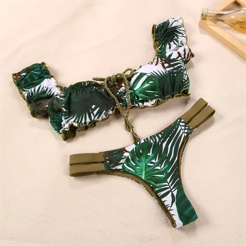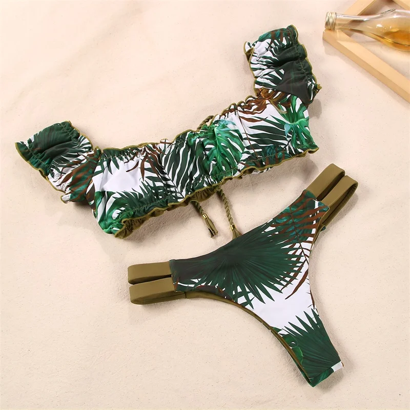 2022 Бикини бандо, бразильский купальник с пуш-ап, женское бикини со складками, сексуальный купальник с принтом, женские бандажные комплекты бикини на одно плечо