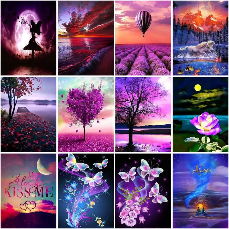 Алмазная 5D картина RUOPOTY сделай сам с бабочками, полноразмерная Алмазная вышивка с фиолетовым пейзажем, мозаика стразы, картина, домашний декор