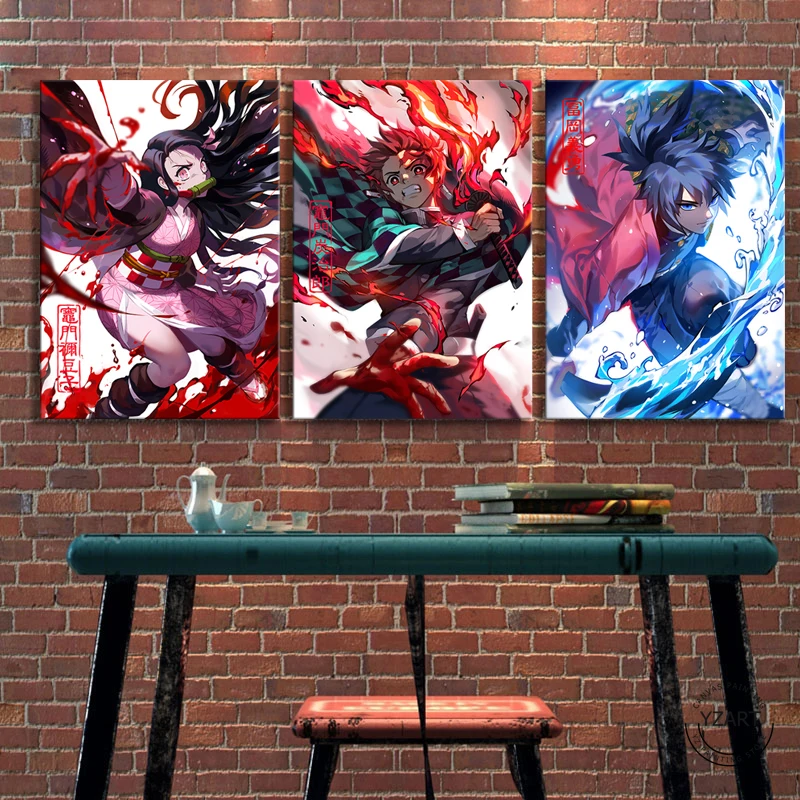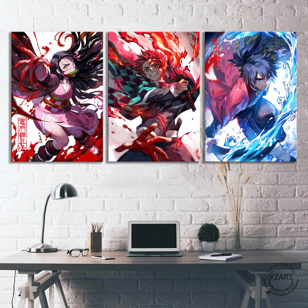 Постер Nezuko Tanjiro Giyu Tomioka рассекающий демонов, декор комнаты, детская комната для девочек, настенное искусство, аниме, настенная живопись без рамки, 3 шт.