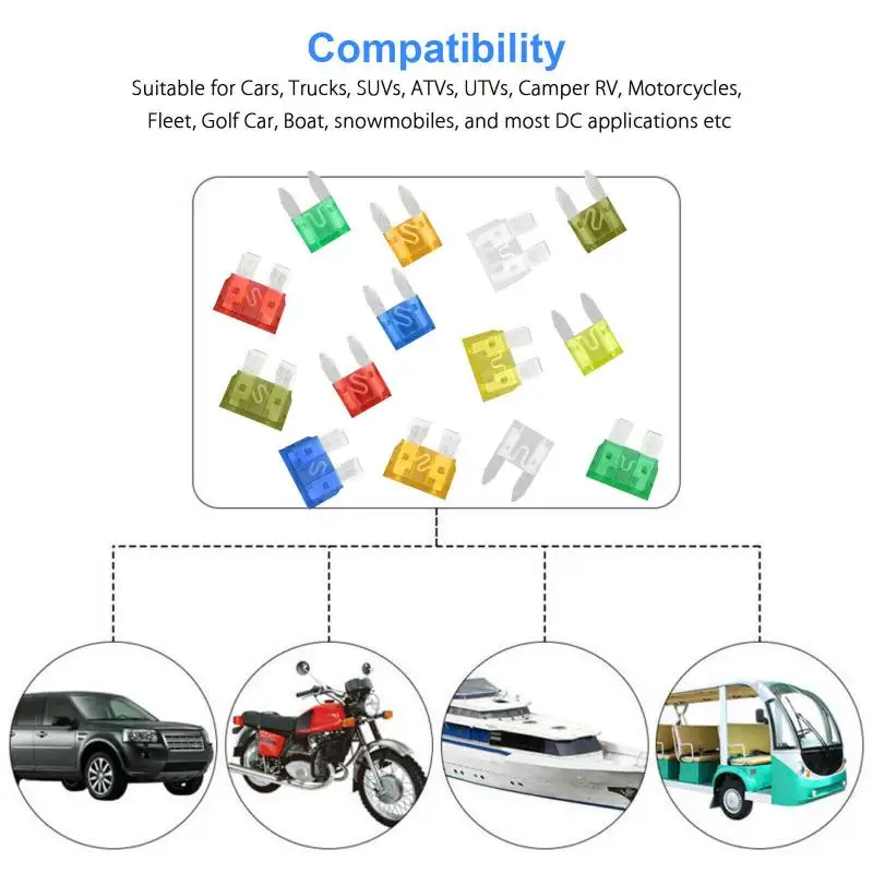 Совместимость: эти различные предохранители специально разработаны для автомобилей, грузовиков, внедорожников, квадроциклов, мотовездеходов, кемперов, мотоциклов, флотов, гольф-машин, лодок, снегоходов и большинства общих приложений постоянного тока и т. Д., покрытие таких компонентов, как радио, светильник, поворотники, И т. Д. Этот набор поставляется с 120 маленькими предохранителями и 100 стандартными предохранителями для лезвий, все необходимые для каждого владельца более одного автомобиля.