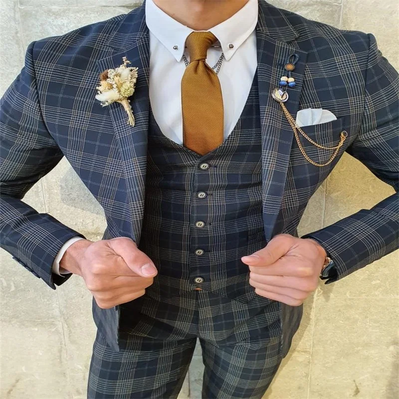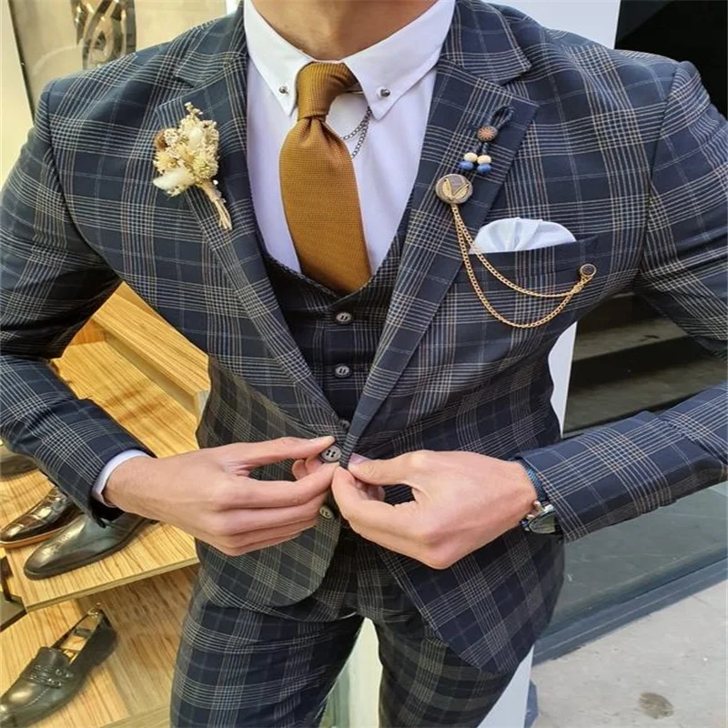 Мужские костюмы из трех предметов, темно-синие повседневные Костюмы...