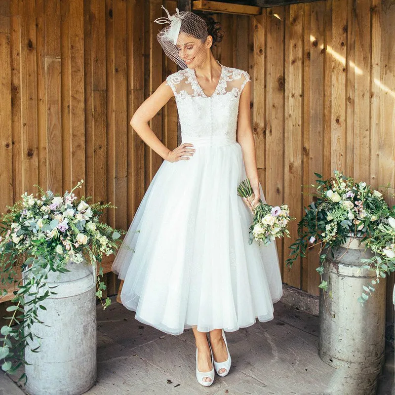 Винтажные Короткие свадебные платья до середины икры 2021, Элегантное свадебное платье с V-образным вырезом и рукавами-крылышками, без рукавов, в стиле бохо, ярко-белое и цвета слоновой кости