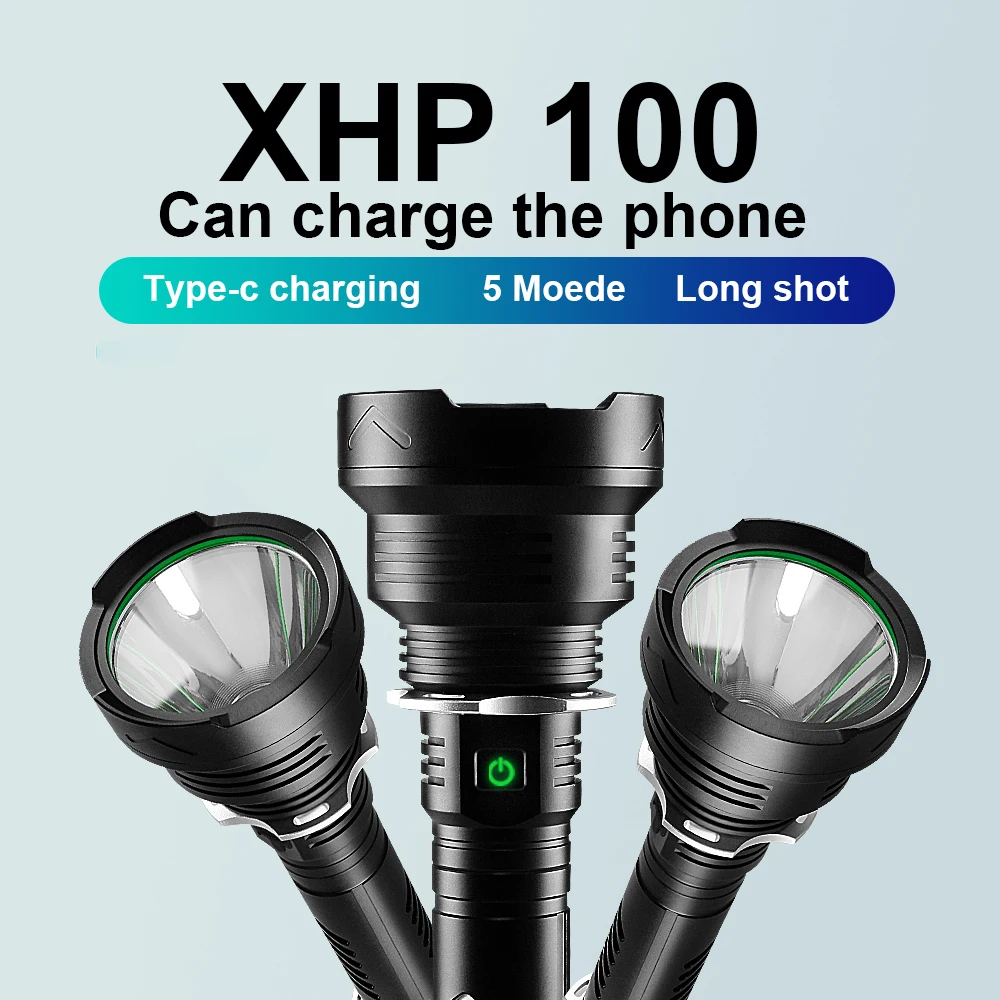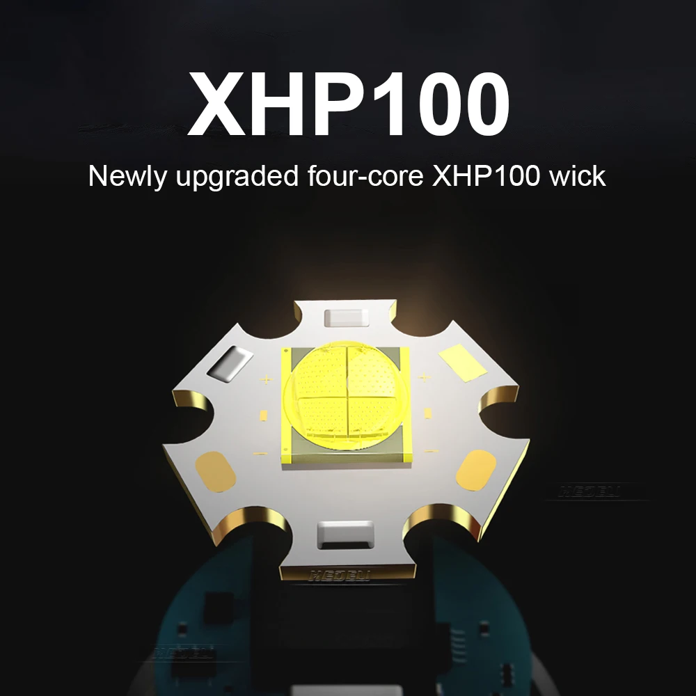 Самый мощный светодиодный фонарик использует светодиодный XHP100, максимальная выходная мощность до 400000 люменовДобавьте 1*18650 или 1*26650 аккумуляторный отсек для увеличения рабочего времениДисплей уровня заряда батареи, micro USB, для компьютера USB, Автомобильный USB, USB разъем для зарядки, перезаряжаемый фонарикОдноступенчатый большой алюминиевый светильник, термостойкийИзготовлен из авиационного алюминиевого сплава, сильный HAIII военный класс Жесткий анодированныйСоответствует IPX-6 стандарту водонепроницаемости, водонепроницаемость, может использоваться в дождливые дни, но не может быть помещен в водуПодходит для работы, охоты, альпинизма, рыбалки, кемпинга и активного отдыха.Ударопрочность 2 метра