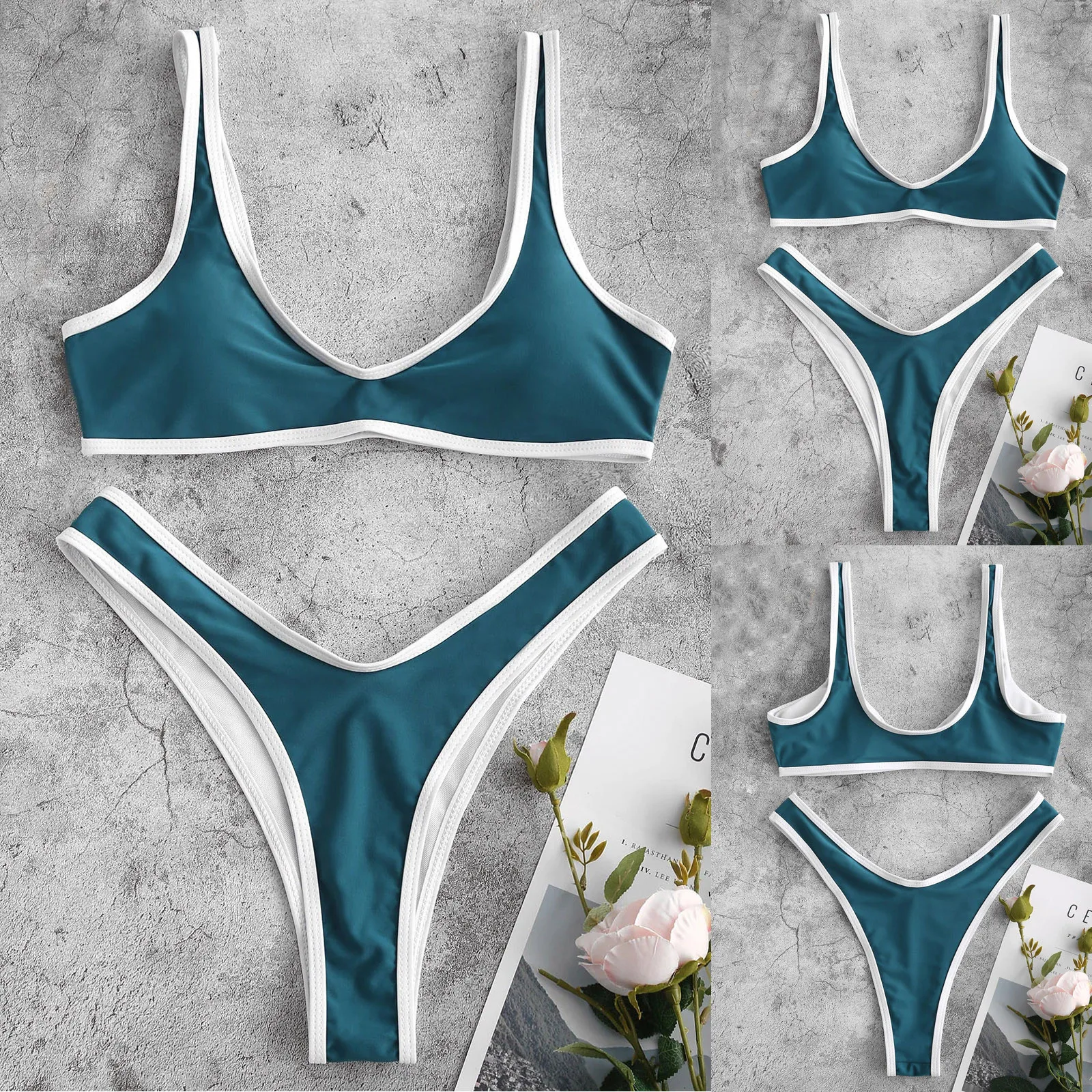 Купальник женский летний с высоким вырезом, пикантный однотонный купальник с чашками пуш-ап, халтер, комплект бикини из двух предметов, пляжный купальный костюм для женщин, 2021