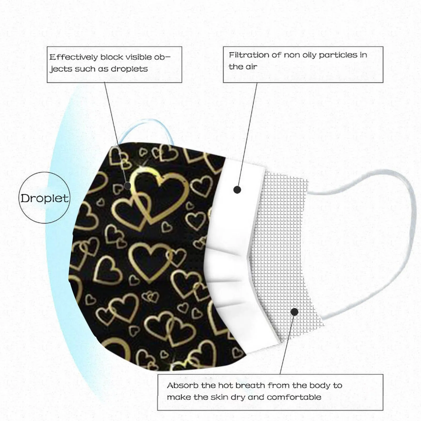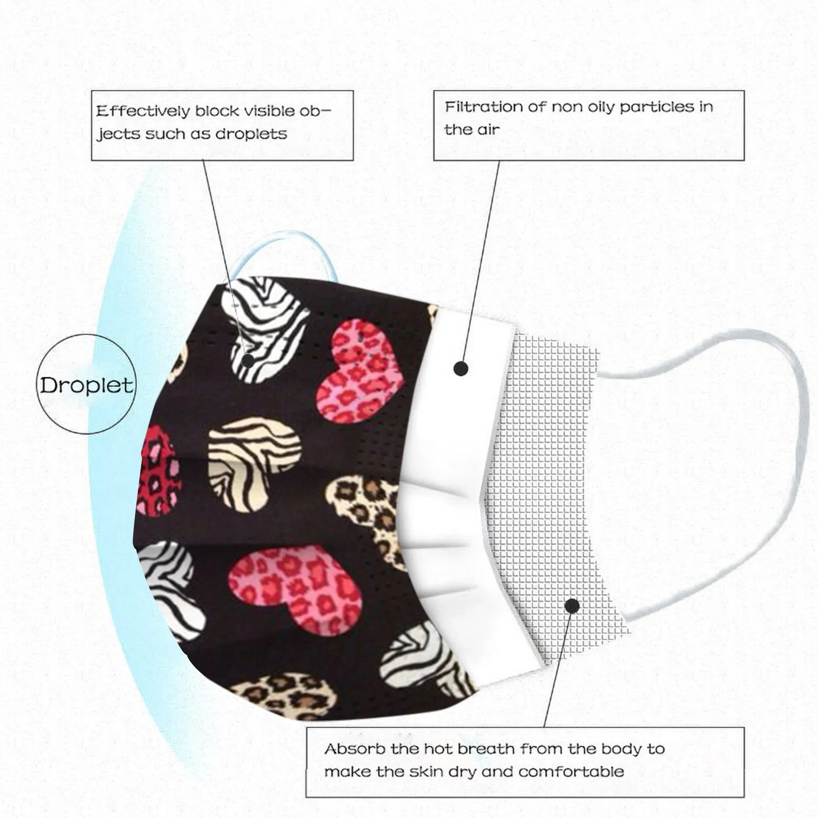 3 слояОдноразовая маска изготовлена из 3 слоев гидросплетенная ткань для тканевого материала,Он безопасен и безопасен для использования. Дышащий материал и милые узоры, что делает его полезным и модным. Специальный 3 слоя из нетканого материала, дизайн, обеспечивает некоторые меры защиты от пыли, автомобильный отходящий газ, пыльцу и т. Д. Эластичная петля уха позволяет легко снимать и надевать цепочку и не давит на уши. Маникюрный салон или любые другие области, где может потребоваться защита