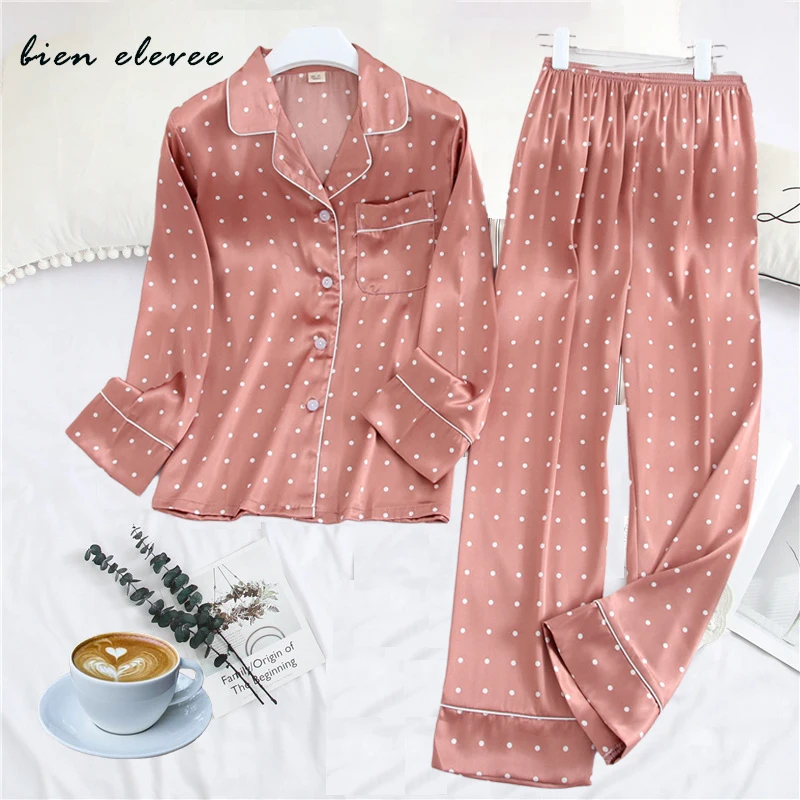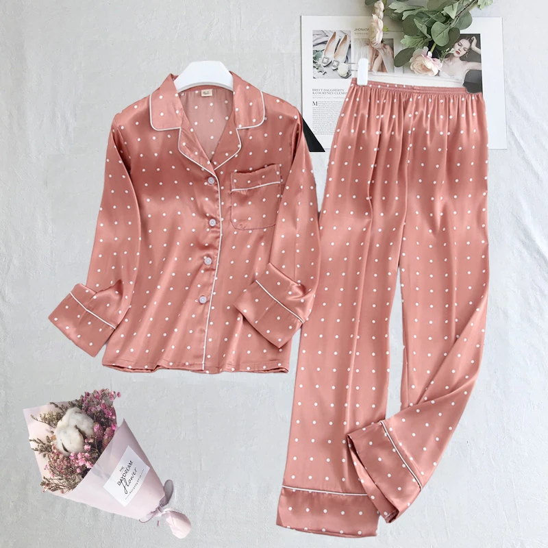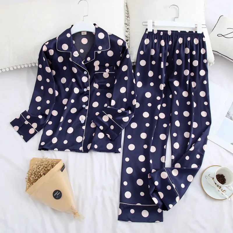 Пижамный комплект с длинным рукавом и брюками, модный осенний пижамный комплект, одежда для сна в горошек, шелковая атласная тонкая верхняя одежда