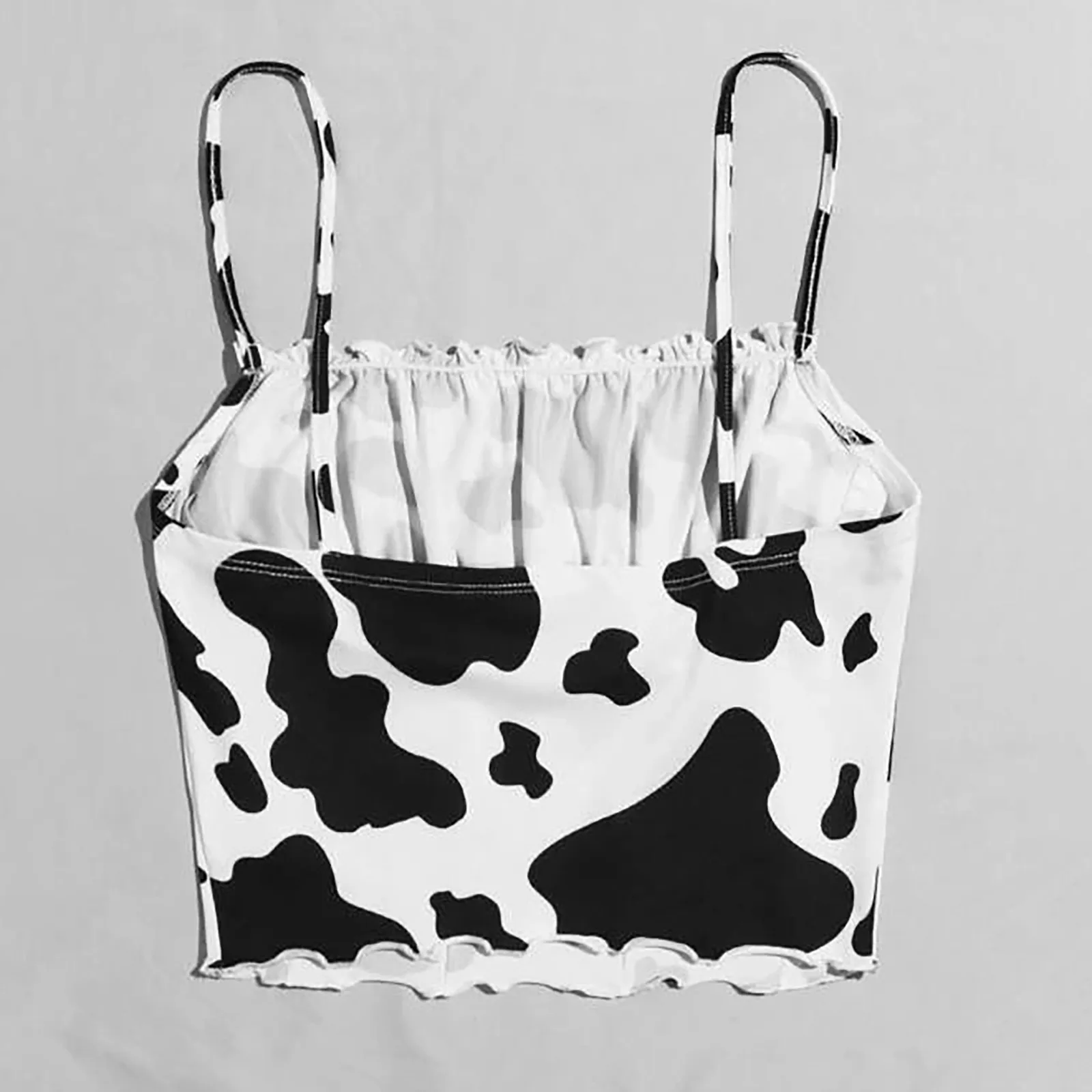 Женский укороченный топ без рукавов, милый кружевной топ на бретелях с низким воротником и принтом коровы, модель Y2k, сексуальное платье для вечеринки
