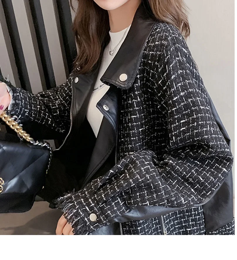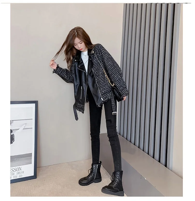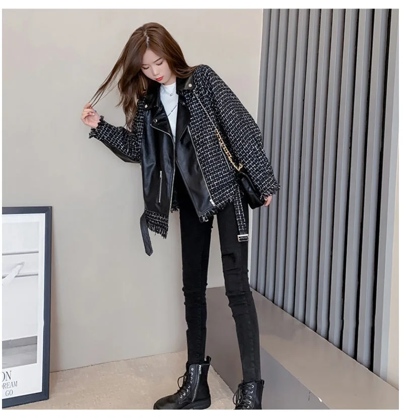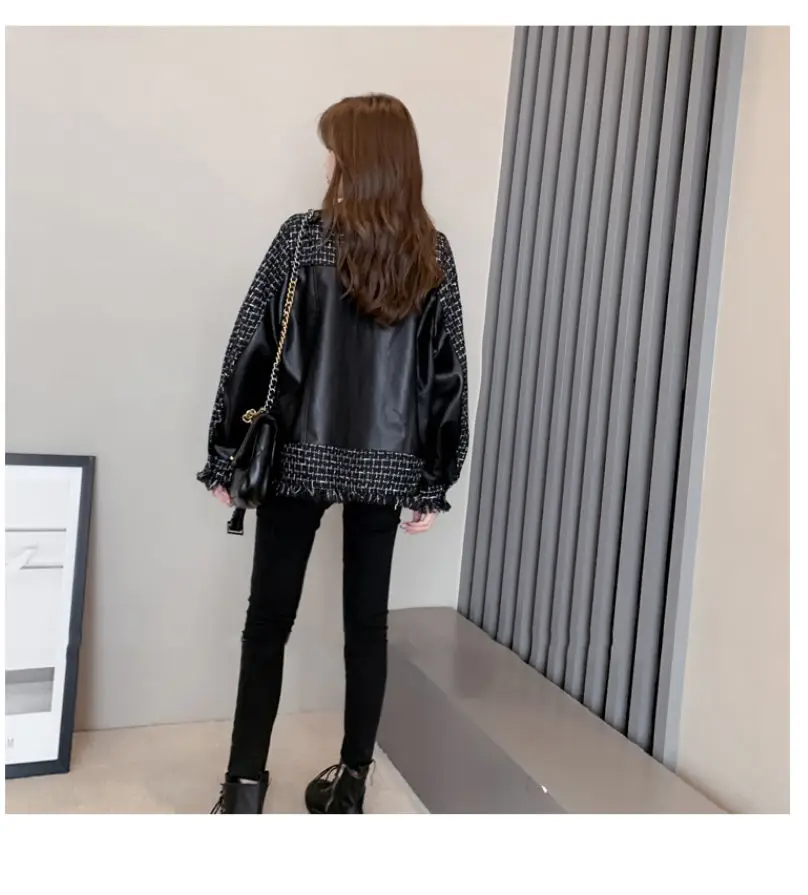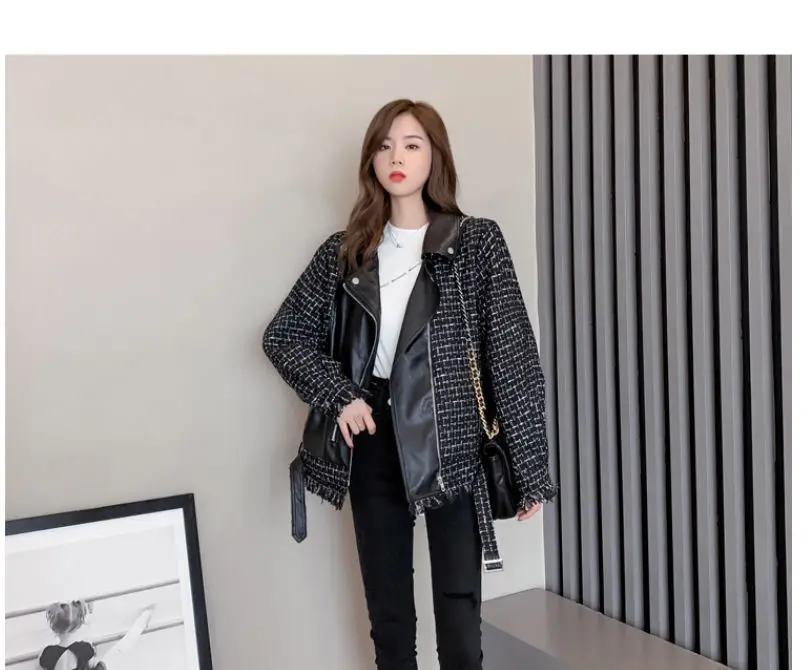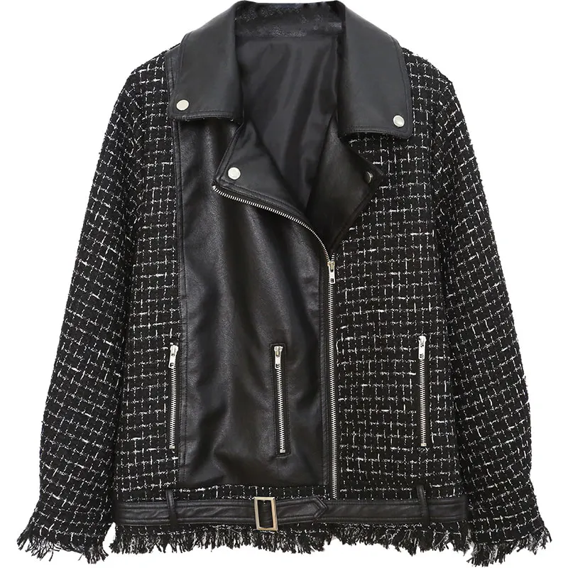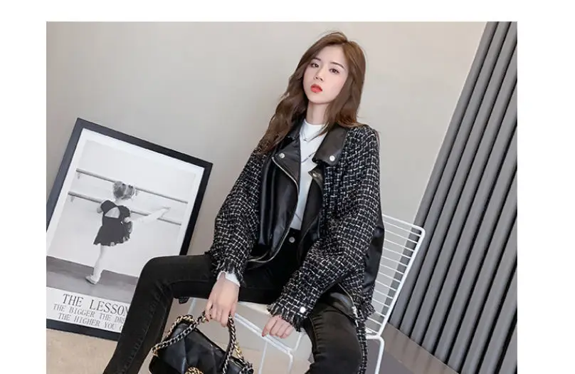 Куртка женская твидовая, из искусственной кожи, в клетку, в стиле пэчворк, весенняя, 2020