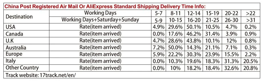 1. Обычно заказ отправляется в течение 24 часов2. Товары будут отправлены заказной авиапочтой Почта Китая, стандартом Aliexpress и E-packet3. Ожидаемая дата доставки будет зависеть от таможни, погоды и т. д., также, пожалуйста, свяжитесь со мной, чтобы продлить время защиты вашего заказа