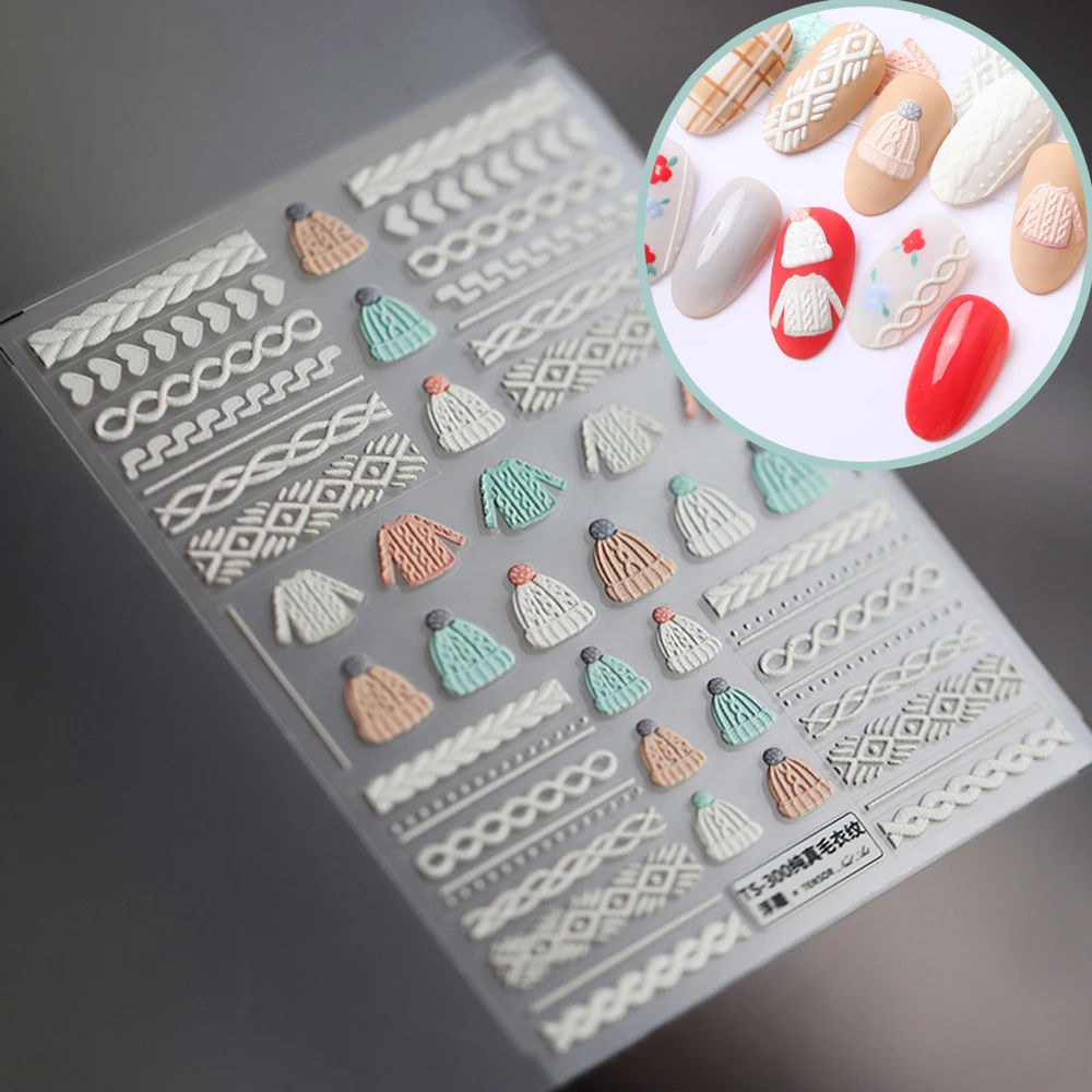 Зимний вязаный свитер тканевый узор для ногтей 5D наклейка для ногтей Выгравированная рельефная Фотография Новый год День Святого Валентина наклейки для ногтей