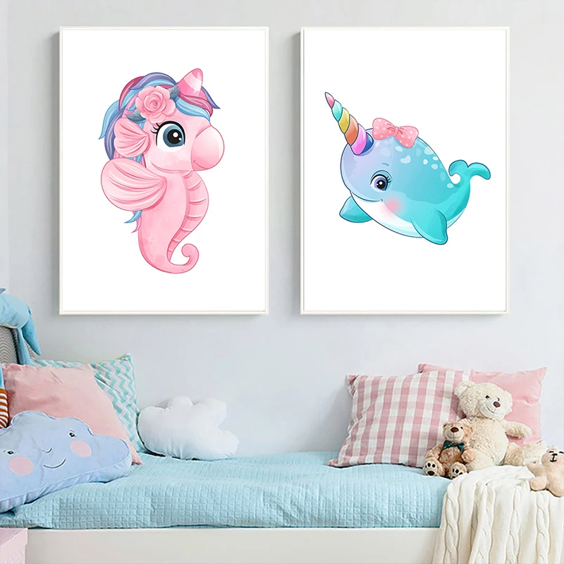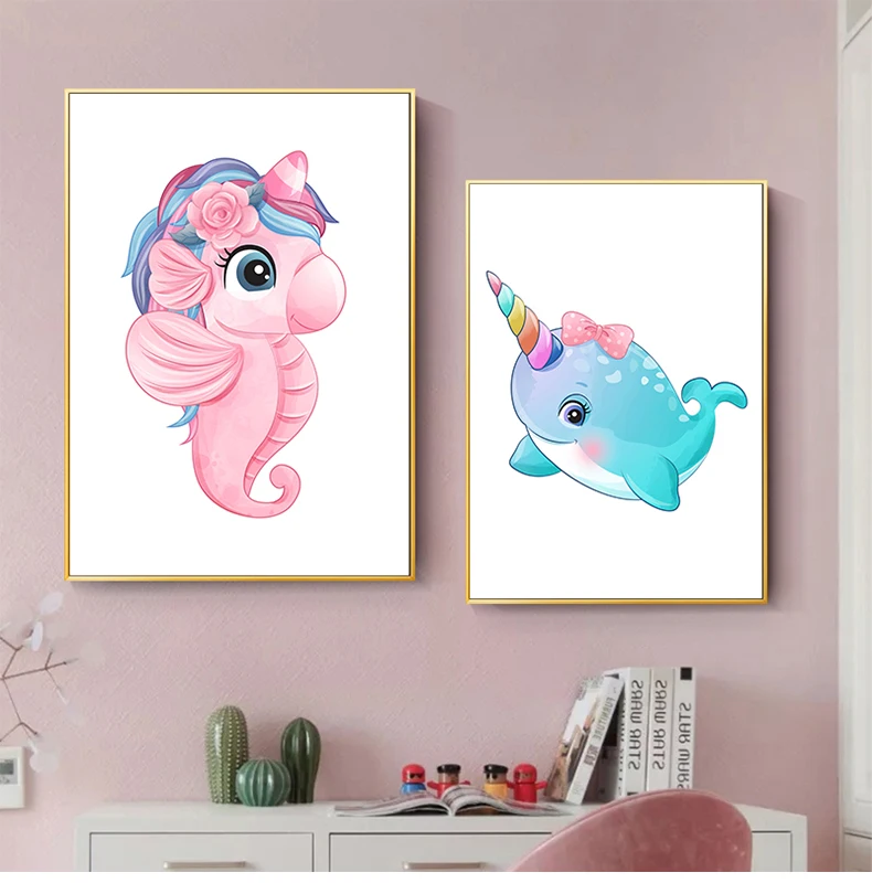 Розовая мультяшная Картина на холсте постер Единорог детская Настен...