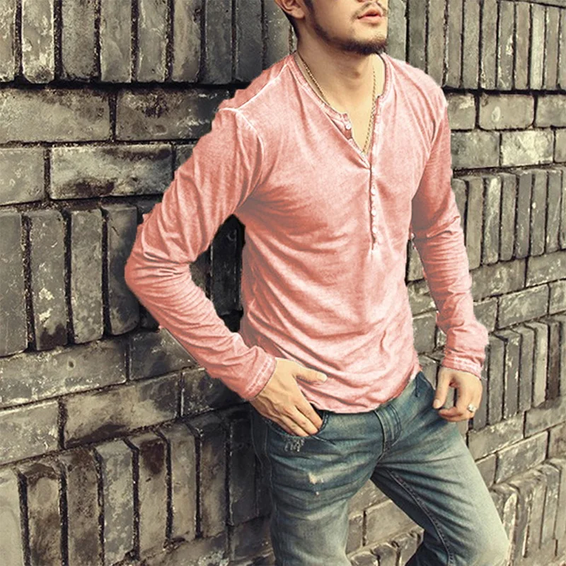 Футболка мужская с V-образным вырезом, Стильная приталенная рубашка с длинным рукавом, Повседневная однотонная одежда на пуговицах, размера плюс, S-3XL, осень 2021