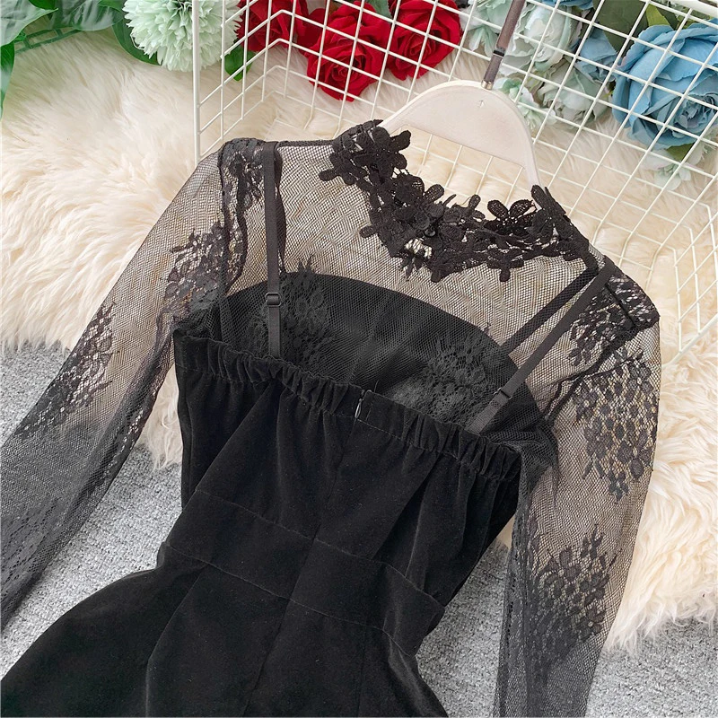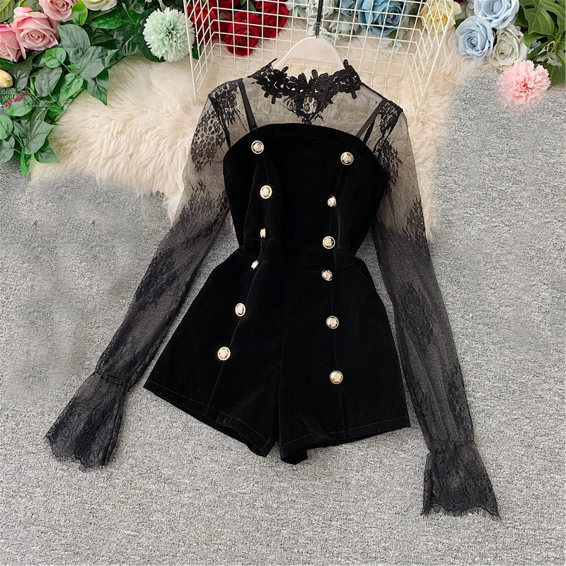 Женский костюм с длинным рукавом, облегающий бархатный двубортный комбинезон с кружевной вышивкой, 2056