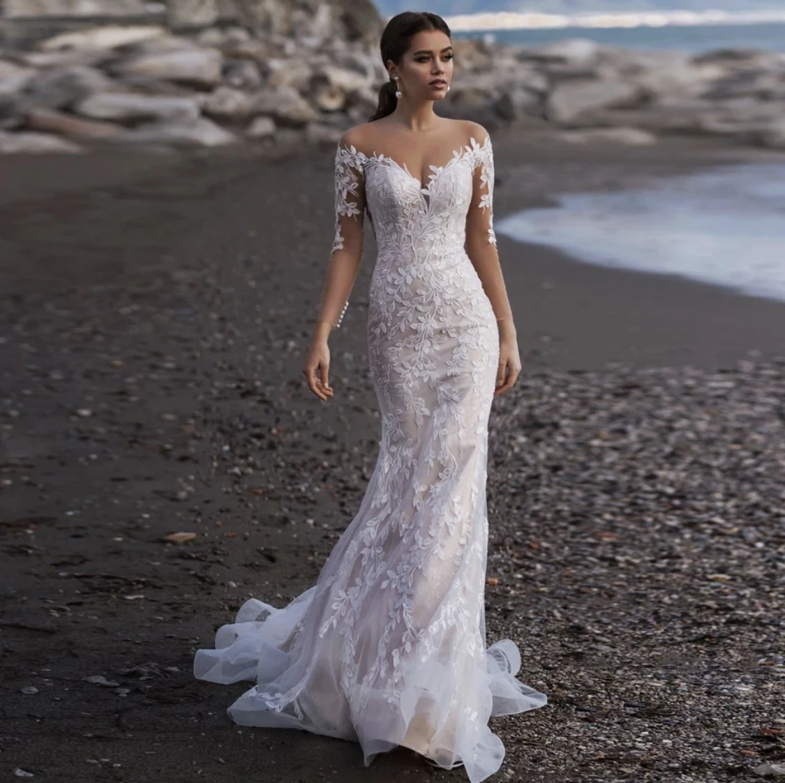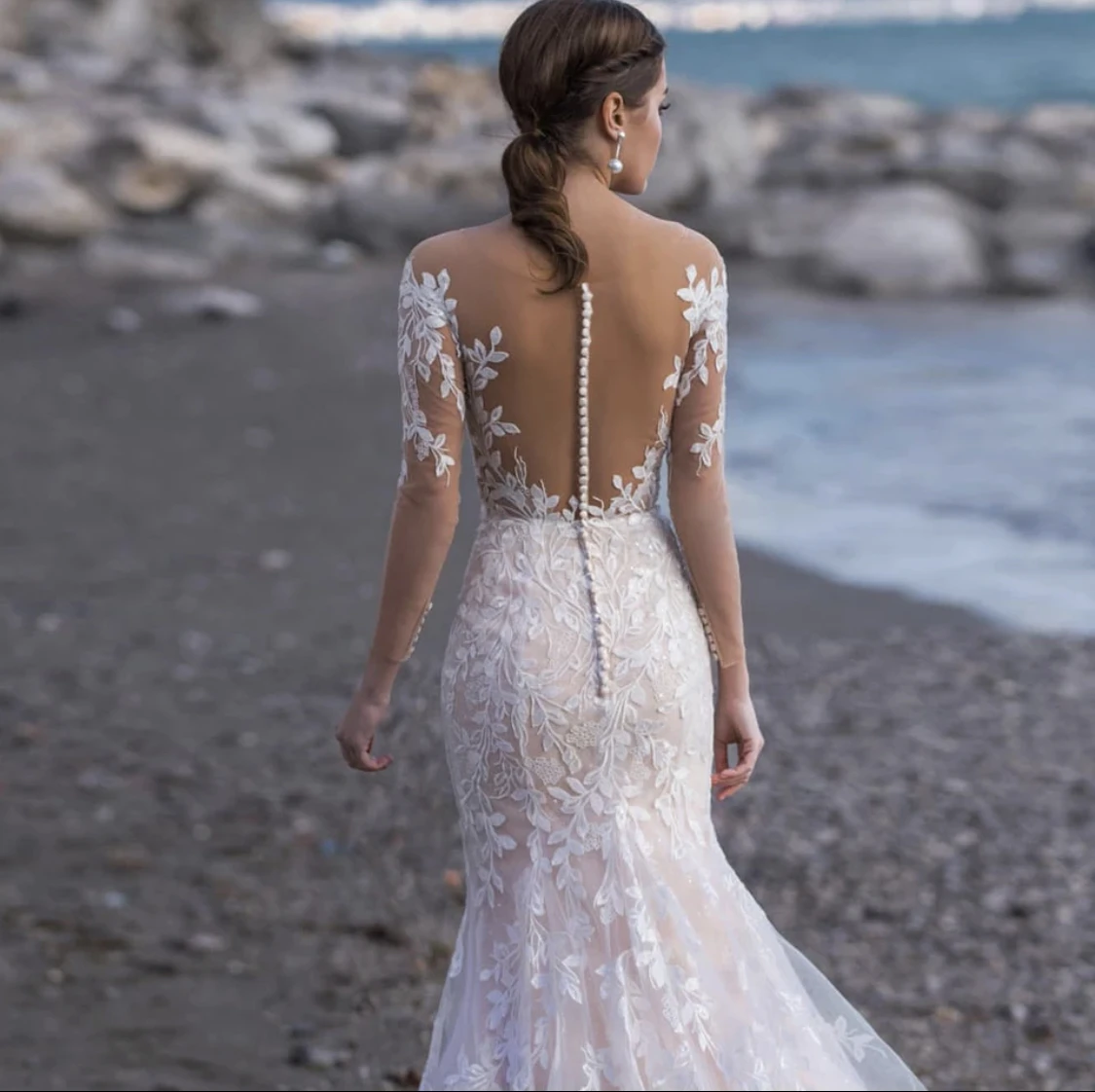 Очаровательное свадебное платье с юбкой годе, прозрачное кружевное платье невесты со шлейфом, длинными рукавами и пуговицами, 2021