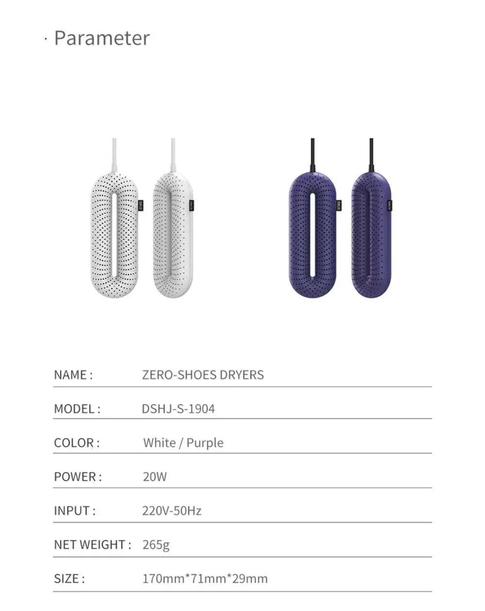 Спецификация:1. Бренд: Sothing2. Модель: машина для нулевой сухой обуви3. Размеры: 170 мм x 71 мм x 29 мм4. Тип: штепсельная вилка EU/UK/AU5. Цвет: белый/фиолетовый6. Мощность: 20 Вт7. Вход: 220v/50 Гц8. Материал: ABS UL94 VO (высокая огнезащитная оболочка)