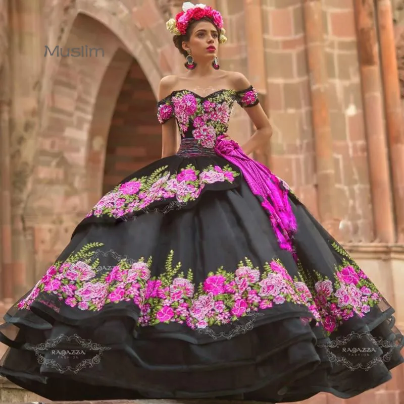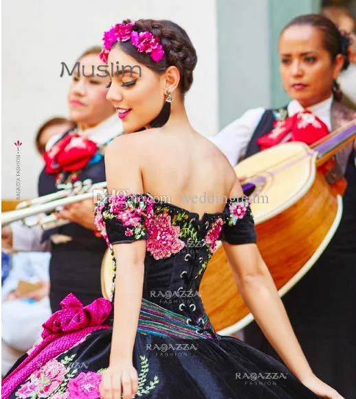 2021 черные платья Quinceanera Charro Съемная юбка с цветочной выши...