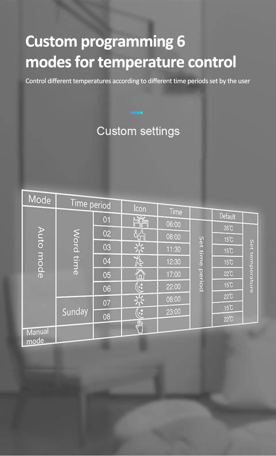 В состоянии выключения термостат автоматически включит нагревательное устройство при температуре ниже 5с градусов, при комнатной температуре выше 7с градусов, термостат автоматически выключит нагревательное устройство. (Можно закрыть эту настройку в расширенной настройке).
