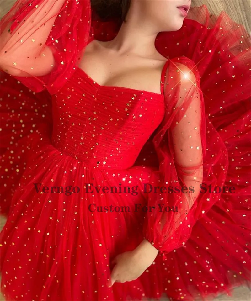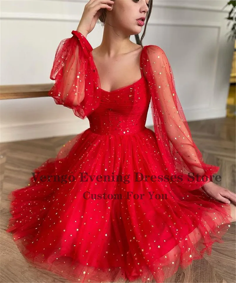 Verngo блестящие золотые звезды красные тюлевые платья для выпускного вечера с пышными длинными рукавами милое ТРАПЕЦИЕВИДНОЕ вечернее платье до колен