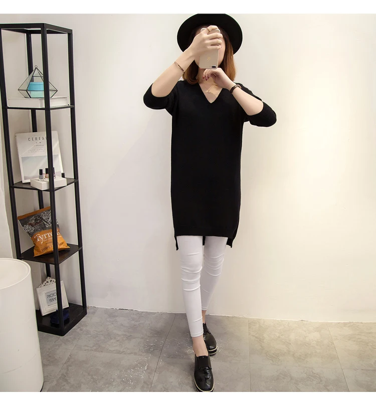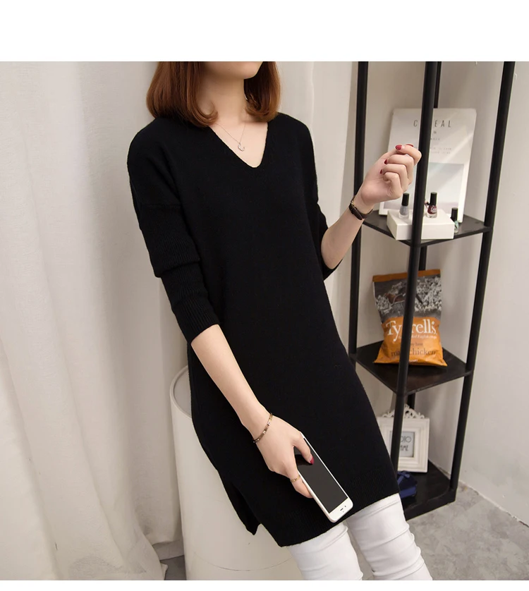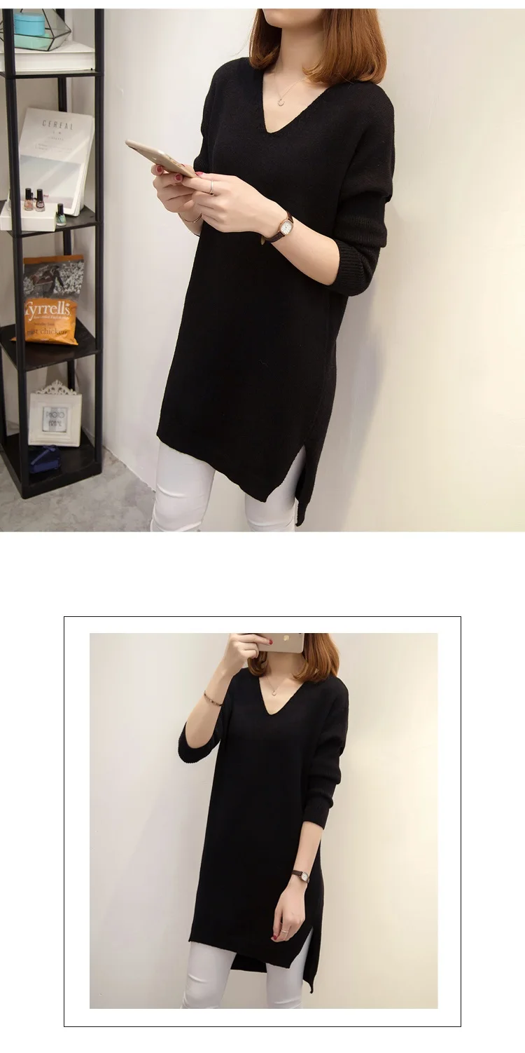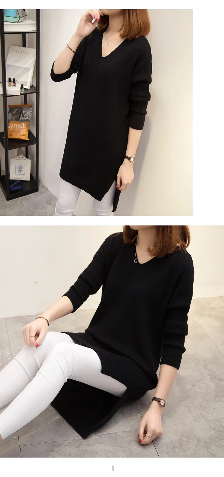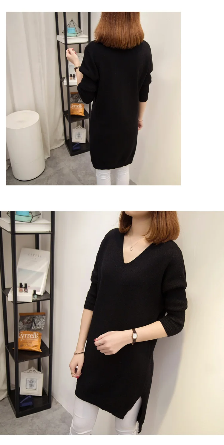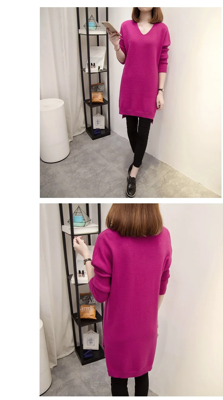 Вязаный Длинный свитер с V-образным вырезом, однотонные повседневные женские пуловеры 4XL, Модный женский пуловер, платье-свитер, Осень-зима, свободный