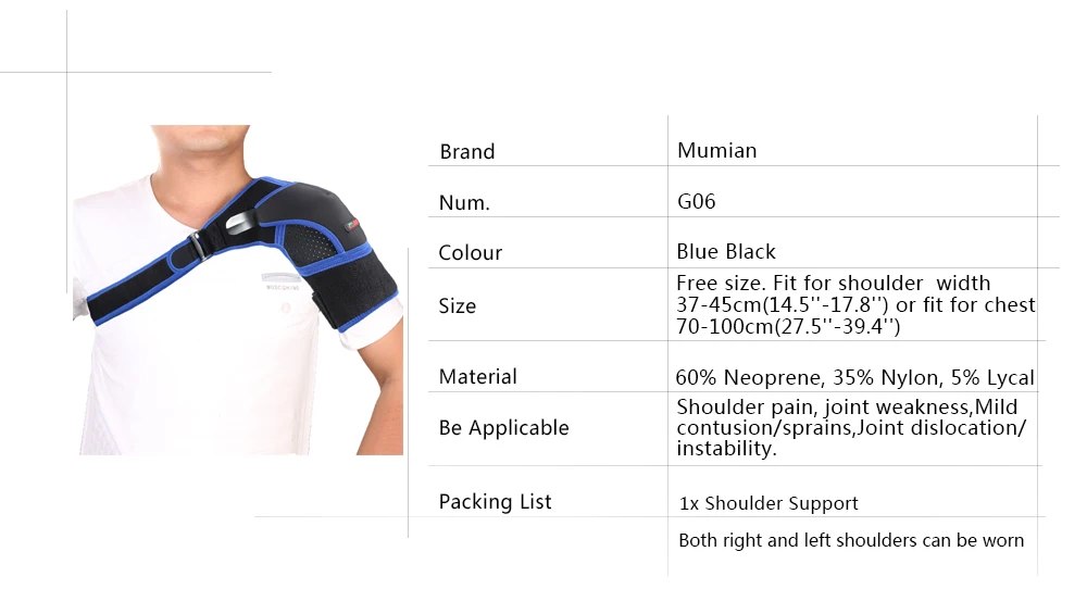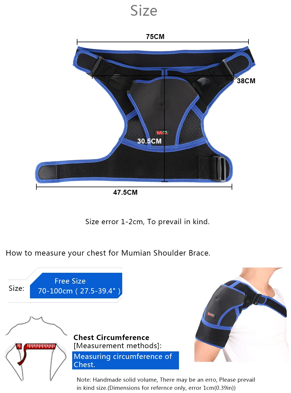 Фиксатор для плеч с регулируемым карманом для льда (не включает горячие или холодные пакеты!) Случайная отправка с логотипом или без логотипа Поддержка и стабильность плеч: плечевой бандаж Fighting Tech обеспечивает среднюю и сильную поддержку плеч. Сохраняя постоянное успокаивающее давление на плечо, наш стабилизатор поможет ускорить процесс восстановления, защитить плечо от дальнейших травм и служит напоминанием о том, чтобы не вытягивать плечо чрезмерно. Облегчение боли: облегчение от замороженного плеча, разрыва манжеты ротатора, вывихнувшегося сустава плеч/переменного тока, разделения переменного тока, бурсит, слеза лабром, болезненность мышц плеч, тендинит, жесткость суставов, сломанная кость плечевой кости, послеоперационная хирургия и многое другое! Многоразовое Использование: предназначено для стабилизации плеча и легкого давления в нужное место, что уменьшает боль при съемке. Наш бандаж для поддержки плеч идеально подходит для активных пользователей, но может также использоваться для стабилизации движения во время сна, В качестве напоминания о том, чтобы не поднимать и не носить тяжелые предметы с этой рукой и, конечно, не ледят плечо при боли. Универсальный дизайн: позволяет носить его на правом или левом плече. Очень регулируемый, унисекс, поставляется в двух размерах (M,L) -подходит для большинства типов и форм тела. Кроме того, стабилизирующая Скоба поставляется с карманом для холодной или горячей упаковки (не входит в комплект), который можно отрегулировать для желаемого сжатия с помощью ремней на липучке. Покупайте с уверенностью: Если вы обнаружите, что-то не хватает, неправильно, плохо прилегает или отличается от ожидаемого, свяжитесь с нами! Мы поможем вам обменять плечевой бандаж или предложим вам полный возврат средств. Характеристики: Бренд: Mumian Модель: G06-airbag Цвет: сине-черный Материал: 65% синтетический каучук, 30% полиэстер, 5% нейлон Размер: L: рука 22,5-41 см, обхват груди: 85-120 см; M: рука 17,5-34,5 см, обхват груди: 65-90 см Модель: можно использовать как левую, так и правую плечи Посылка входит 1x поддержка плеча