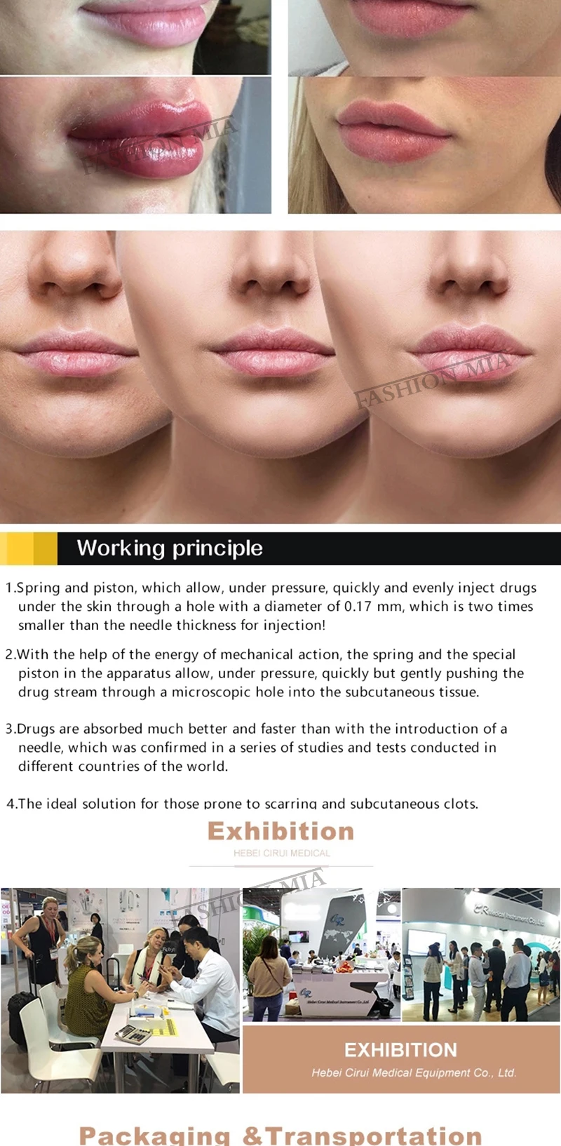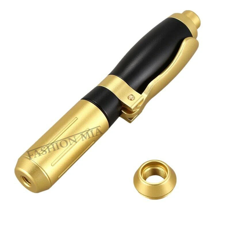 Спецификация: Тип изделия: 2 в 1 гиалуроновая ручка Цвет: черный, золотой Материал: нержавеющая сталь Количество Одиночная впрыска: 0,05-0,5 мл (5-50IU) Время использования: 2000 раз Глубина впрыска: 4-6 мм Размеры: 0,3 мл и 0,5 мл Объем: 0,01 мл ~ 0,12 мл (минимальный масштаб 1 рамка 0,01 мл, в том случае, если вы хотите, чтобы играть в 0,05, затем вниз 5 кадров, максимум 12 кадров-0,12 мл, самый большой масштаб 0,5 мл) Характеристика: 1. Без иглы: Многие люди страдали от игольчатой фобии. Наша технология без игл облегчает игольную фобию без игл. 2. Практически без боли: Быстрая инъекция менее 1/3 секунды, микро отверстие и автоматическое пружинное давление делают инъекции с «серой» практически безболезненными 3. Быстро, легко и безопасно: Он может быть использован пациентами для самостоятельной инъекции, или другие лица могут вводить инъекции назначенного лекарства. 4. Нет риска травм игольчатой палки: Он устраняет повреждения игольчатой палки, так же как и без игл, тем самым снижая затраты на удаление, устраняет перекрестное загрязнение 5. Сопло и адаптер стерилизуются гамма-облучением: Они одноразовые, что исключает возможность перекрестного загрязнения. 6. Длительный срок службы и низкое техническое обслуживание: Используется для более чем 10000 инъекций, и Он управляется самоприводной пружиной.