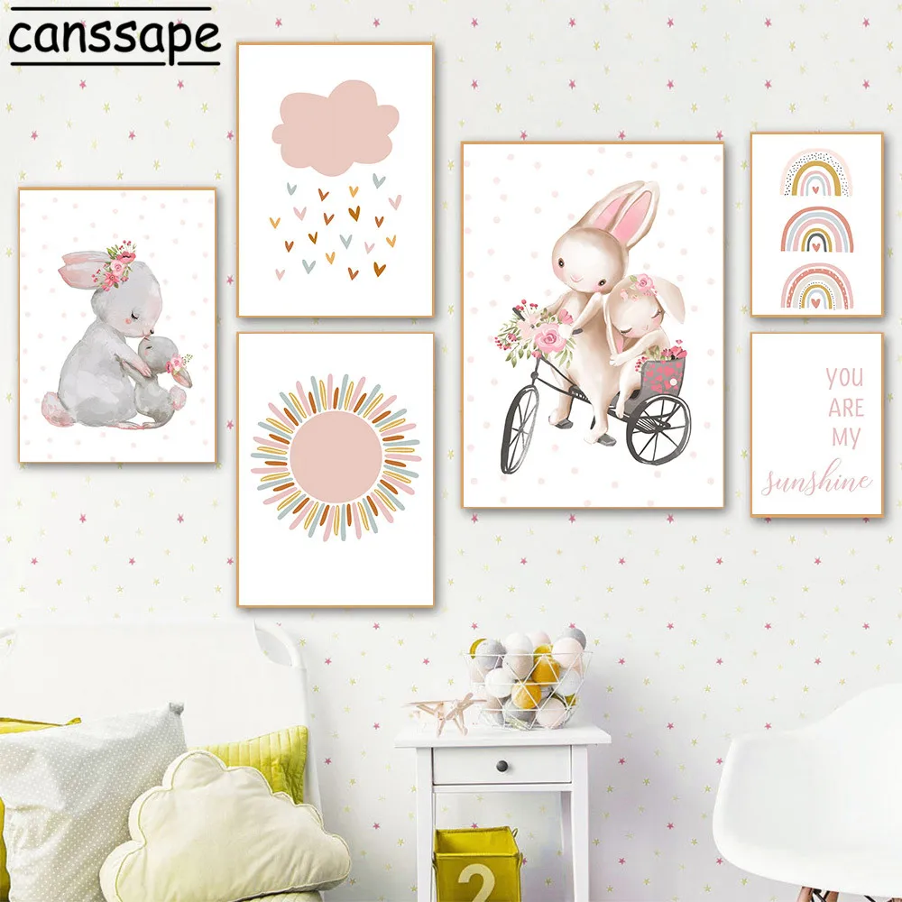 Плакат с кроликом, солнцем, радугой, рисунок для детской, настенная живопись, рисунок кролика, скандинавские настенные картины для декора детской комнаты