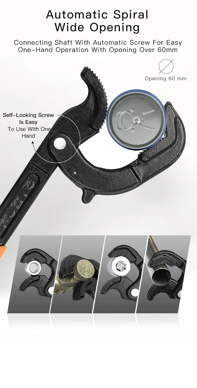 Особенности:1. Регулируемое отверстие, подходит практически для всех типов гаек и болтов2. Кованая хром-ванадиевая сталь, высокая твердость и трудно повредить3. Резиновая ручка, легко держать4. В нескольких спецификациях