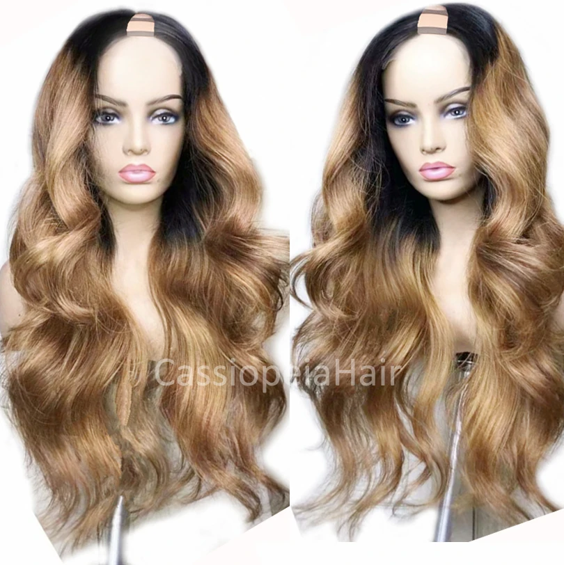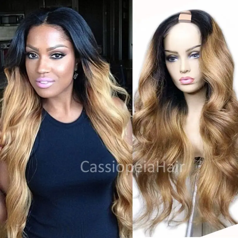 Темно-корень Омбре блонд объемная волна U часть человеческих волос парик для женщин Цвет 27 # Омбре бразильские волнистые u-образные парик 28 дюймов 200% плотность