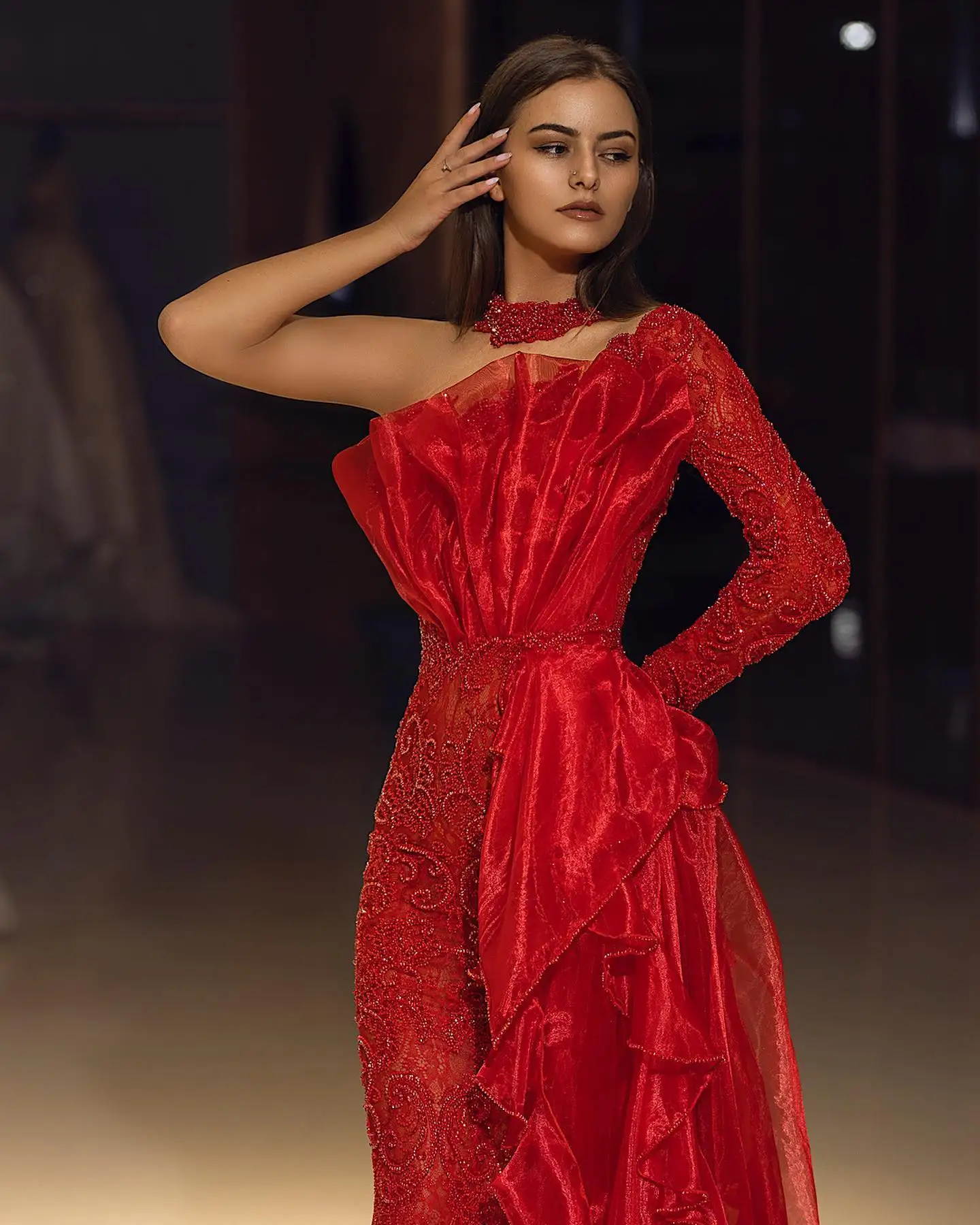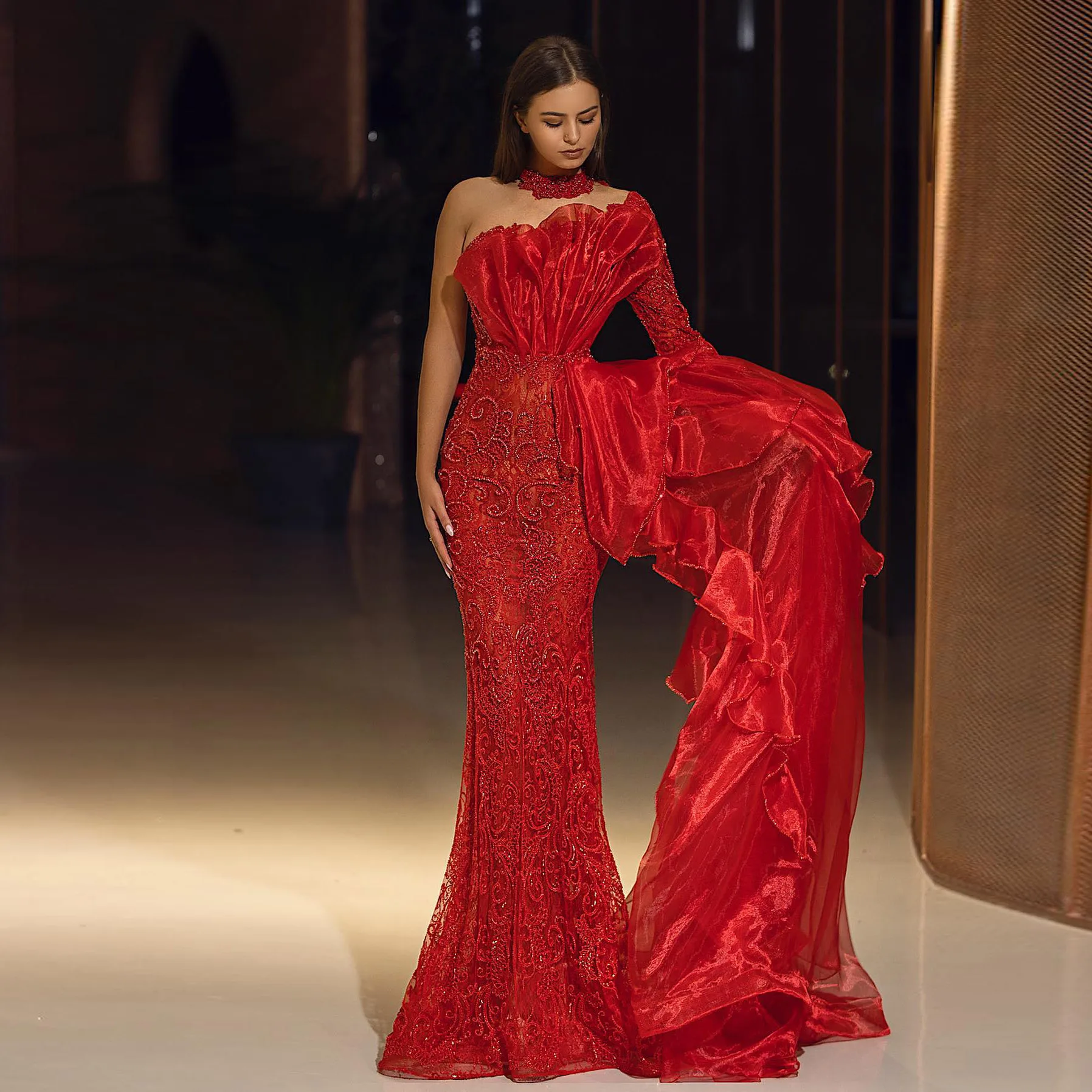 Привлекательные Красные кружевные вечерние платья-русалки с юбкой с запахом, длинное свадебное платье на одно плечо с бусинами, платье для выпускного вечера с уникальным вырезом