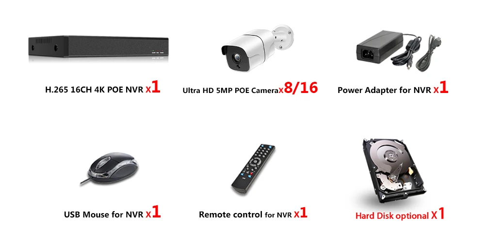 1 сетевой видеорегистратор 16CH 4K POE NVR;8/16 X HD POE IP 5.0MP Крытый Открытый ИК День ночного видения атмосферостойкие камеры;1 X Блок питания для NVR;1 х USB мышь для NVR;1 компакт-диск программного обеспечения для NVR;1 пульт дистанционного управления для NVR;Жесткий диск опционально!