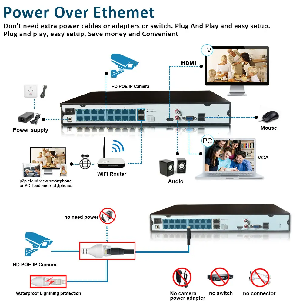 Нет дополнительных кабелей питания или адаптеров, просто подключив ip-камеру к NVR с помощью одного кабеля, вы можете легко завершить установку без знания о компьютере или сети и начать наслаждаться супер простым мониторингом среди вашего смартфона, планшета или ПК.Экономьте деньги и удобный POE NVR = NVR + POE коммутатор, подключи и работай и простая настройка!