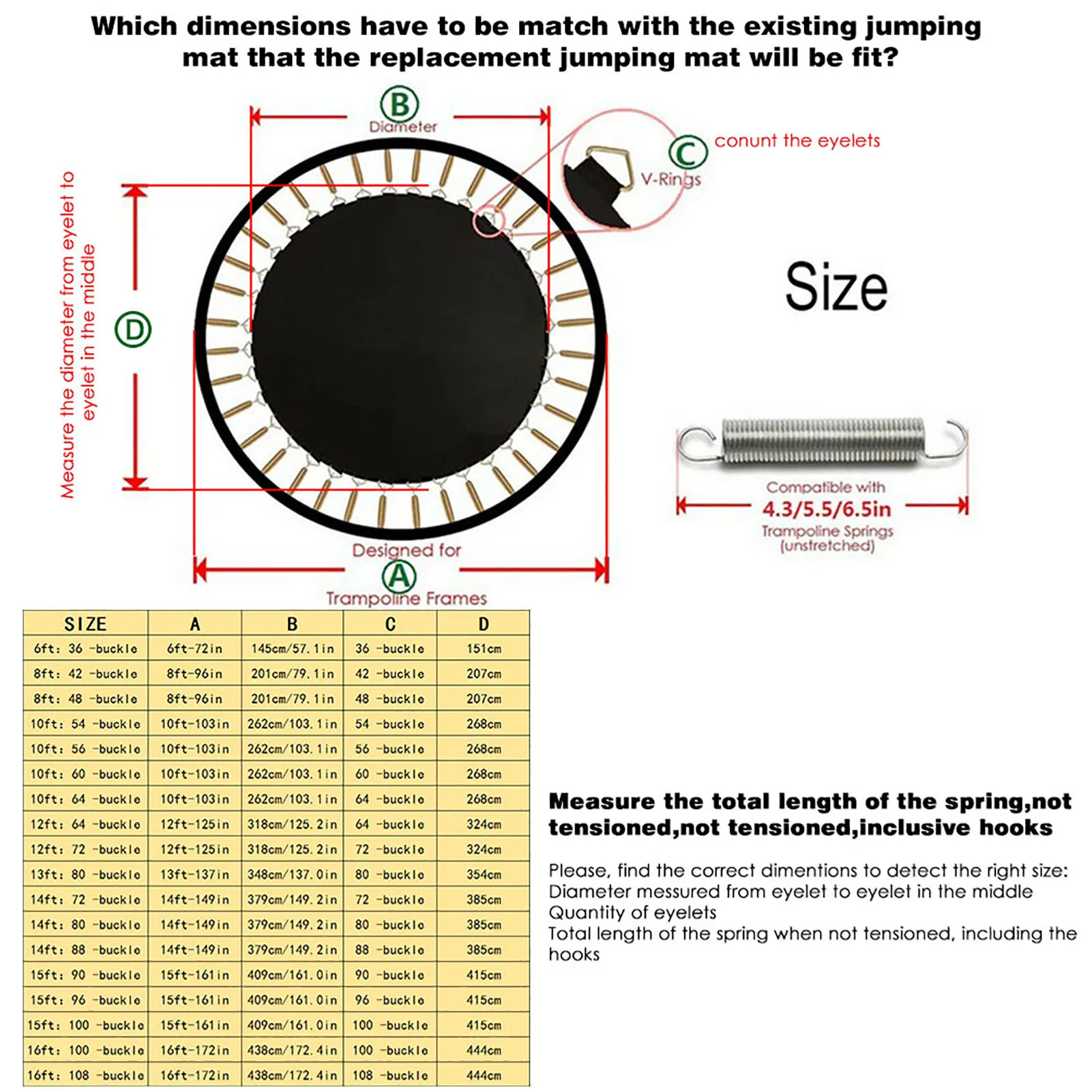 6 футов в диаметре 1,83 метра/72,05 дюйма коврик (36 пряжек)8 футов диаметром 2,44 метра/дюйма коврик (48 пряжек)10 футов диаметром 3,05 метра/120,08 дюйма коврик (54 пряжки)10 футов в диаметре 3,05 метра/120,08 дюйма коврик (60 пряжек)10 футов в диаметре 3,05 метра/120,08 дюйма коврик (64 пряжки)12 футов в диаметре 3,66 метра/дюйма коврик (72 пряжки)13 футов в диаметре 3,96 метра/155.91in коврик (80 пряжек)14 футов в диаметре 4,27 метра/дюйма коврик (80 пряжек)Коврик 15 футов в диаметре 4,57 метра/дюйма (90 пряжек)15 футов в диаметре 4,57 метра/дюйма коврик (96 пряжек)15 футов в диаметре 4,57 метра/100 дюйма коврик (пряжек)16 футов в диаметре 4,88 метра/108 дюйма коврик (пряжек)Упаковочный лист:Коврик для трамплина * 1 (с треугольной пряжкой для легкой установки и снятия)
