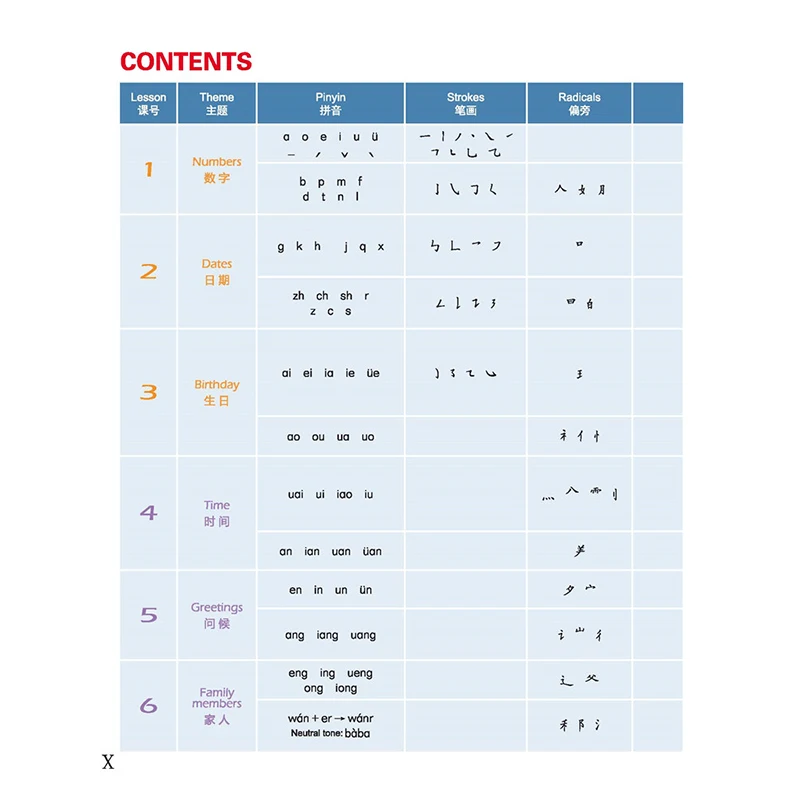 Серия подчеркивает важность обучения основных штрихов и составных штрихов, порядка хода, радикалов и структур символов. Для усиления познания персонажей предоставляются упражнения для письма.