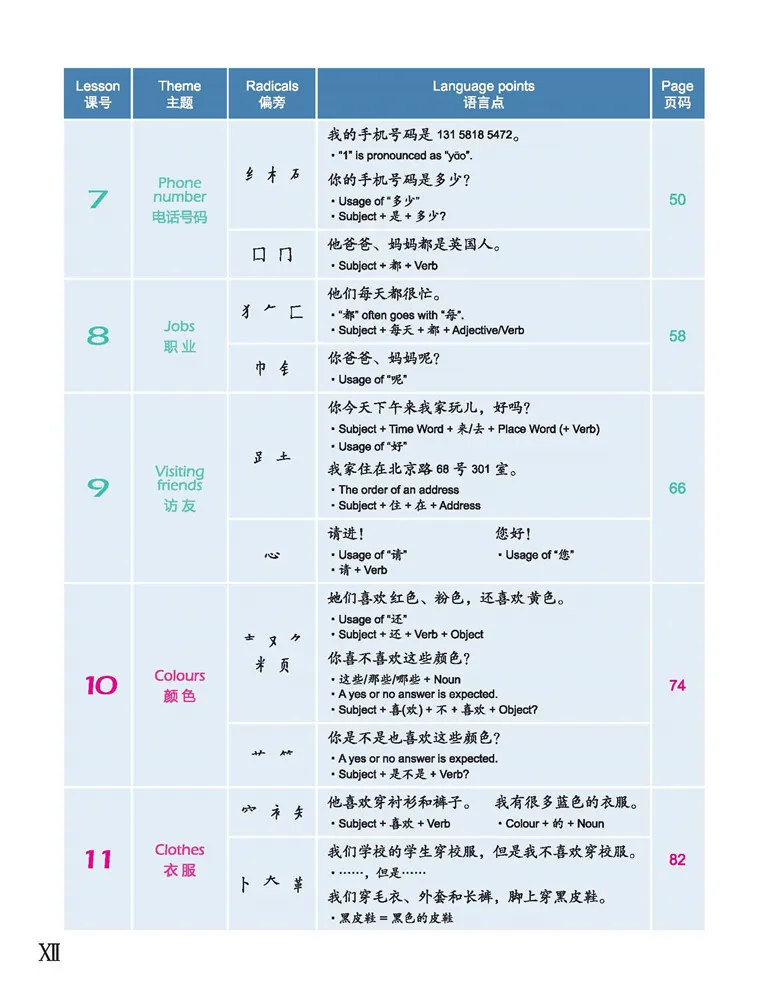 Для того, чтобы ученики лучше понимали и легче запоминали новые слова и фразы, была предпринята попытку гарантировать, что только один символ в каждой фразу является новым, И дается только одно значение этого нового персонажа. Для каждого урока новые слова и фразы перечислены в основном в соответствии с тем, что они появляются в текст; Однако некоторые фразы, содержащие один и тот же персонаж, перечислены вместе для удобства обучения.