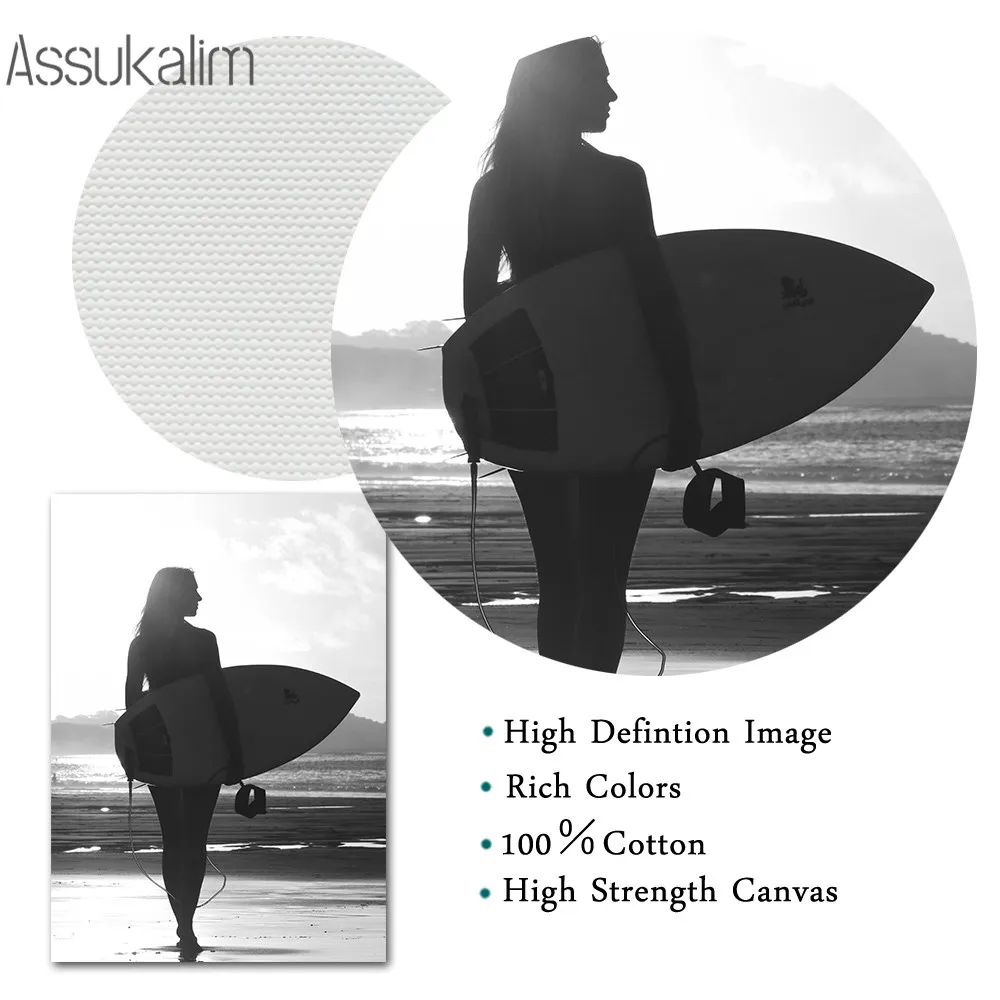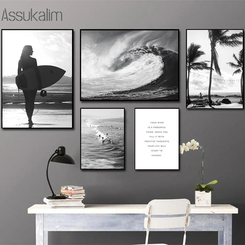 Плакат с серфингом, черно-белая печать на холсте, плакаты Пляж океан, картина на стену в скандинавском стиле для гостиной, домашнего декора