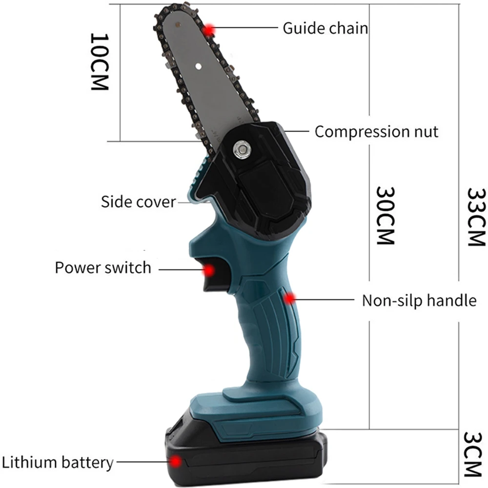 Перезаряжаемая Электрическая цепная пила, светильник и портативный, длительный срок службы батареи, без повреждений коры.Светильник вес тела, светильник и удобный, светильник вес конструкции, долгое время хранения и не устают руки.Щеточный двигатель из чистой меди, высокая мощность, быстрая резка, повышение эффективности.Практичная, быстрая скорость, низкое энергопотребление.Переключатель отличного качества, быстрая и медленная регулировка, плавное изменение скорости.Интеллектуальная плата управления цепью, защита от перегрузки, для удовлетворения ваших различных потребностей в конструкции.Специальная направляющая пластина, шарик из вольфрамовой стали не нужно смазывать, так что машина уменьшает сопротивление во время эксплуатации и уменьшает износ на машине.Маленький размер, можно держать одной рукой.Высококачественная направляющая цепь, глубокая закалка, более износостойкая, гладкая резка.Идеальный инструмент для вырубки отвечает различным потребностям многих ситуаций.