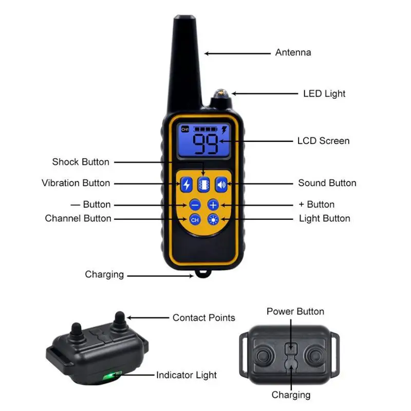 -Регулируемые Уровни: уровни вибрации и ударов регулируются от 1 до 99, и вам рекомендуется постепенно попробовать уровни, чтобы найти подходящий при первом использовании этой системы для тренировки питомцев