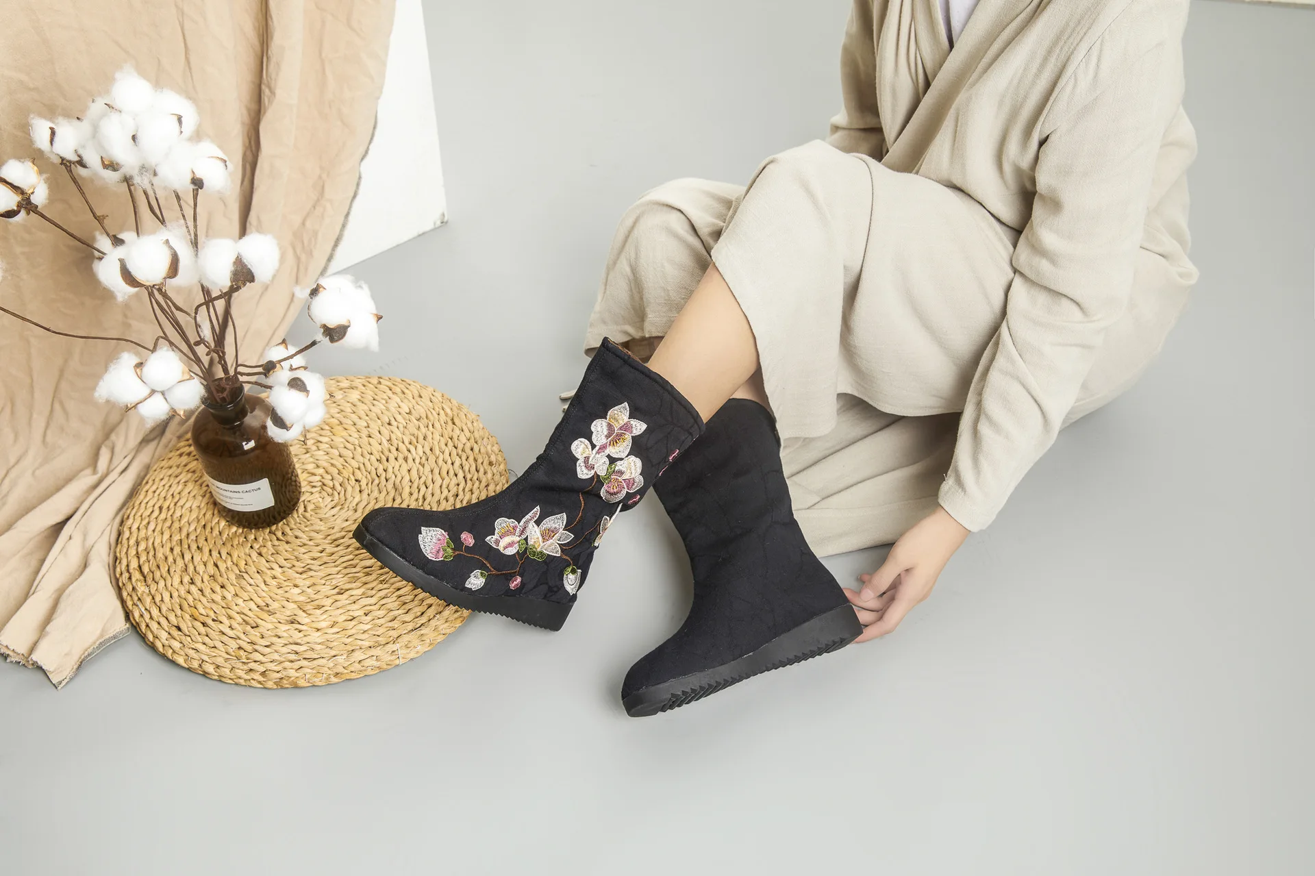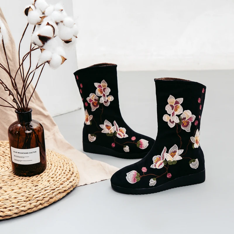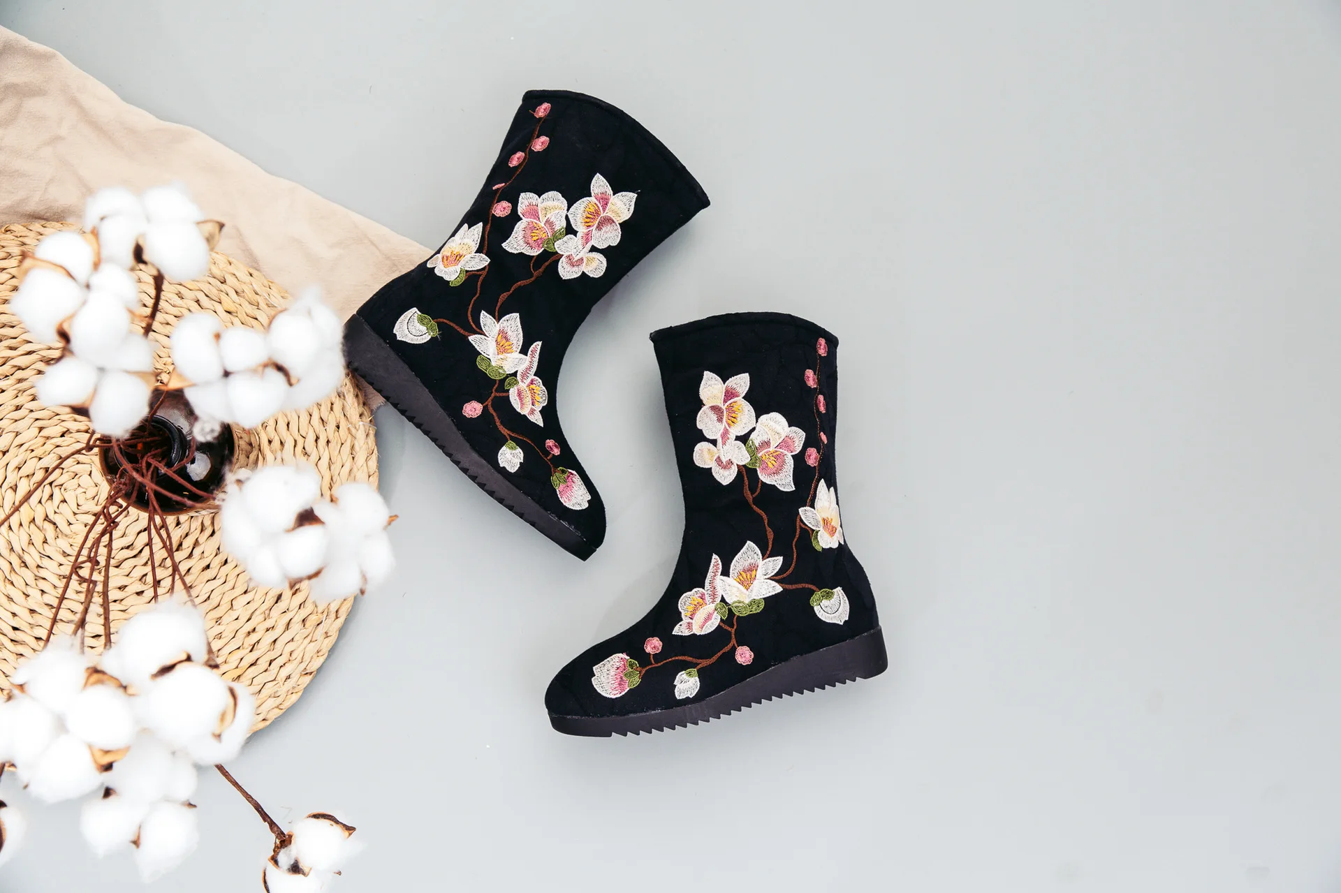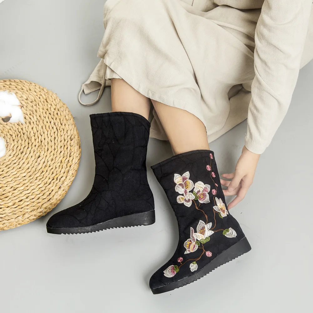 Теплые зимние хлопковые туфли в китайском стиле с ручной вышивкой и бархатной подкладкой, костюм для косплея Hanfu, Женская хлопковая обувь средней длины