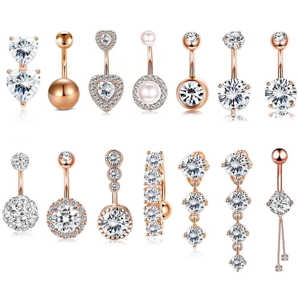 Набор колец для пупка, 14 шт.лот, с двойным круглым фианитом, из стали 316L, для пирсинга живота, ювелирные украшения для тела