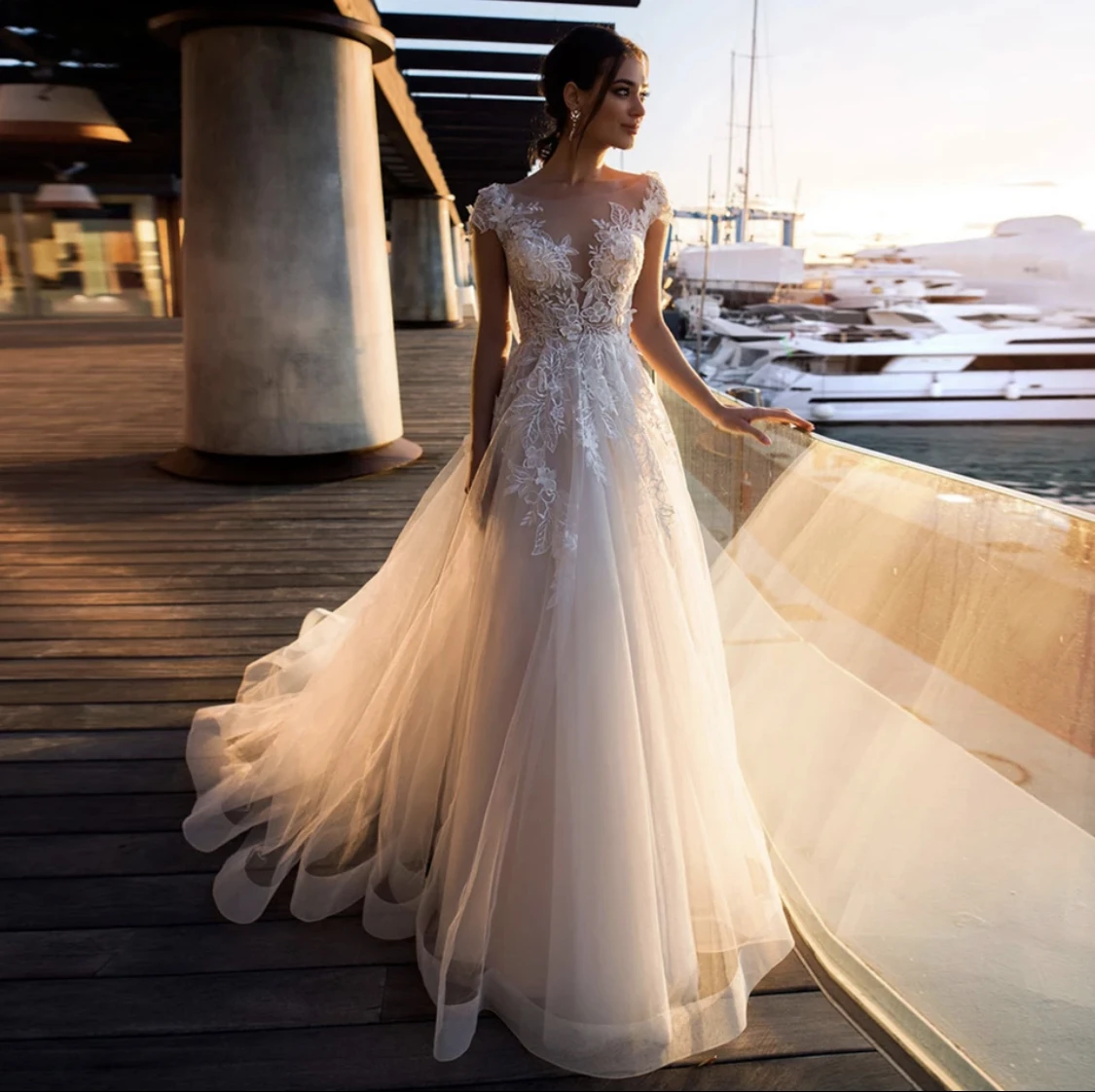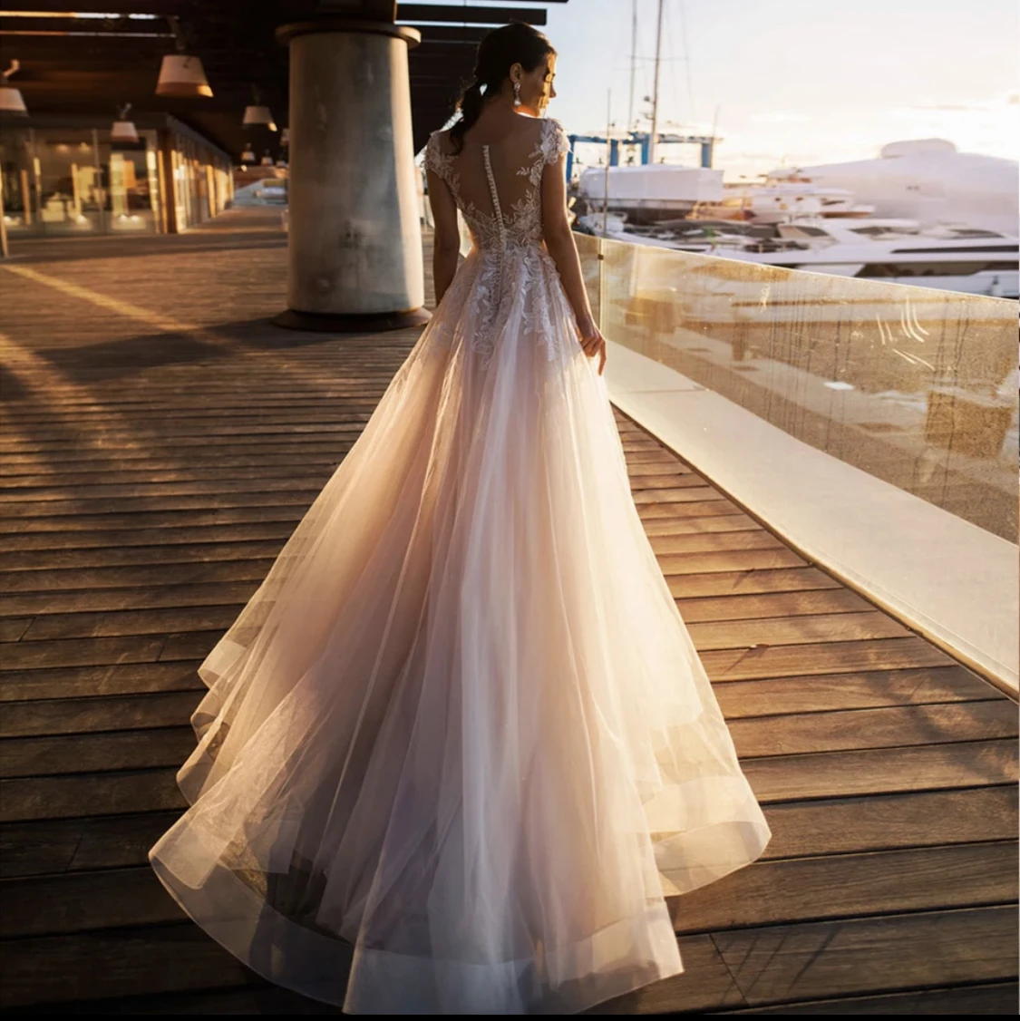 Элегантное свадебное платье 2021, ТРАПЕЦИЕВИДНОЕ Прозрачное платье с коротким рукавом и кружевной аппликацией на пуговицах, Тюлевое платье невесты со шлейфом