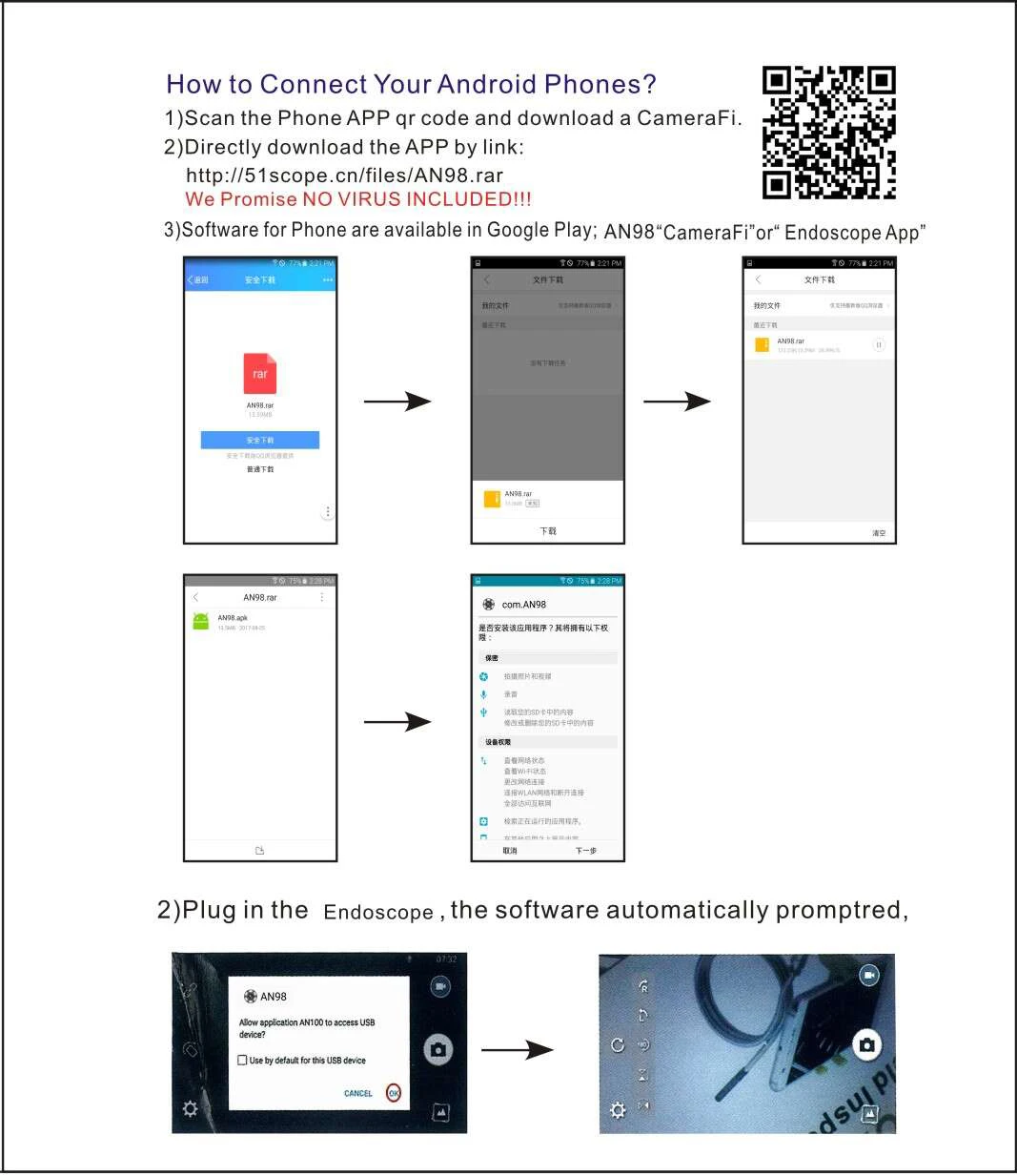 1. На телефонах Android: отсканируйте QR-код в руководстве, чтобы установить приложение, или перейдите по ссылке для загрузки, чтобы установить приложение, затем на мобильном рабочем столе появится значок, нажмите на значок, продукт доступен для использования. Этот эндоскоп android очень прост в эксплуатации, просто загрузите приложение и вставьте эндоскоп в свое устройство, приложение автоматически распознает его (Пожалуйста, убедитесь, что в вашем телефоне есть OTG, функция UVC и поддержка внешней камеры). 2. На компьютере: установите программное обеспечение в компьютер fistly (загрузите его из Интернета), затем откройте программное обеспечение, Вставьте камеру в компьютер, драйвер будет установлен в компьютер автоматически. После этого данную камеру можно использовать на компьютере с программным обеспечением.