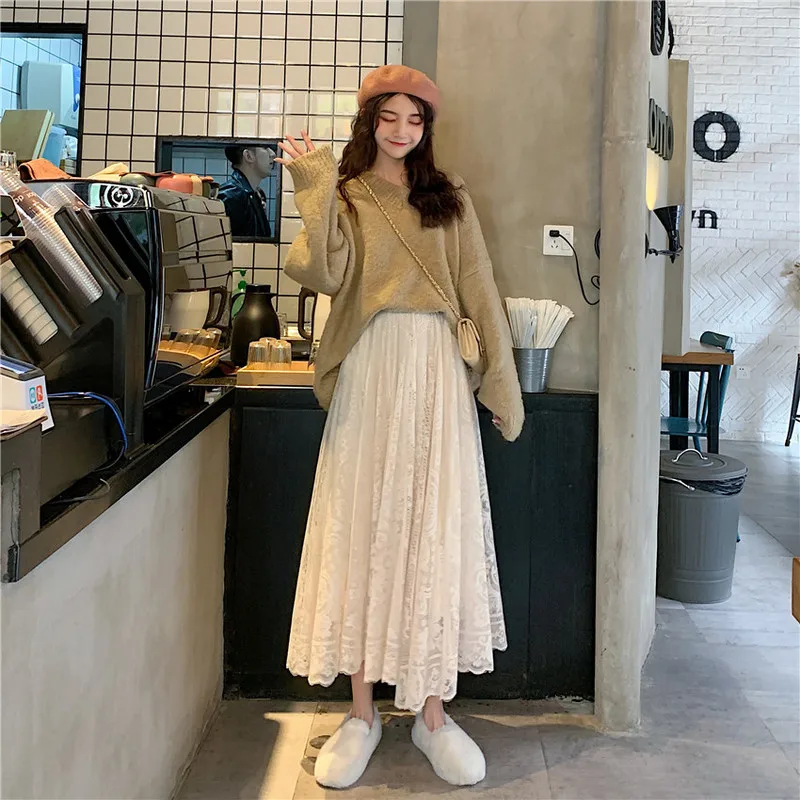 Эластичная кружевная юбка с завышенной талией, женская весна-осень, новая Корейская элегантная повседневная трапециевидная черная длинная юбка, 13063