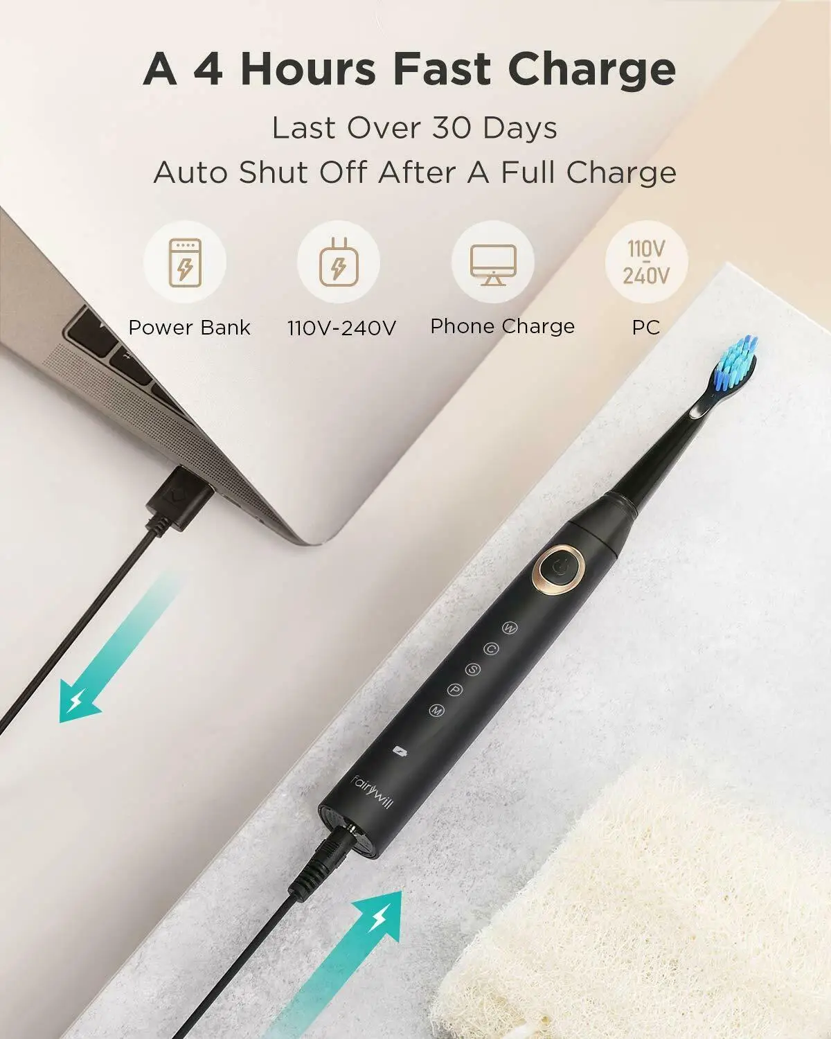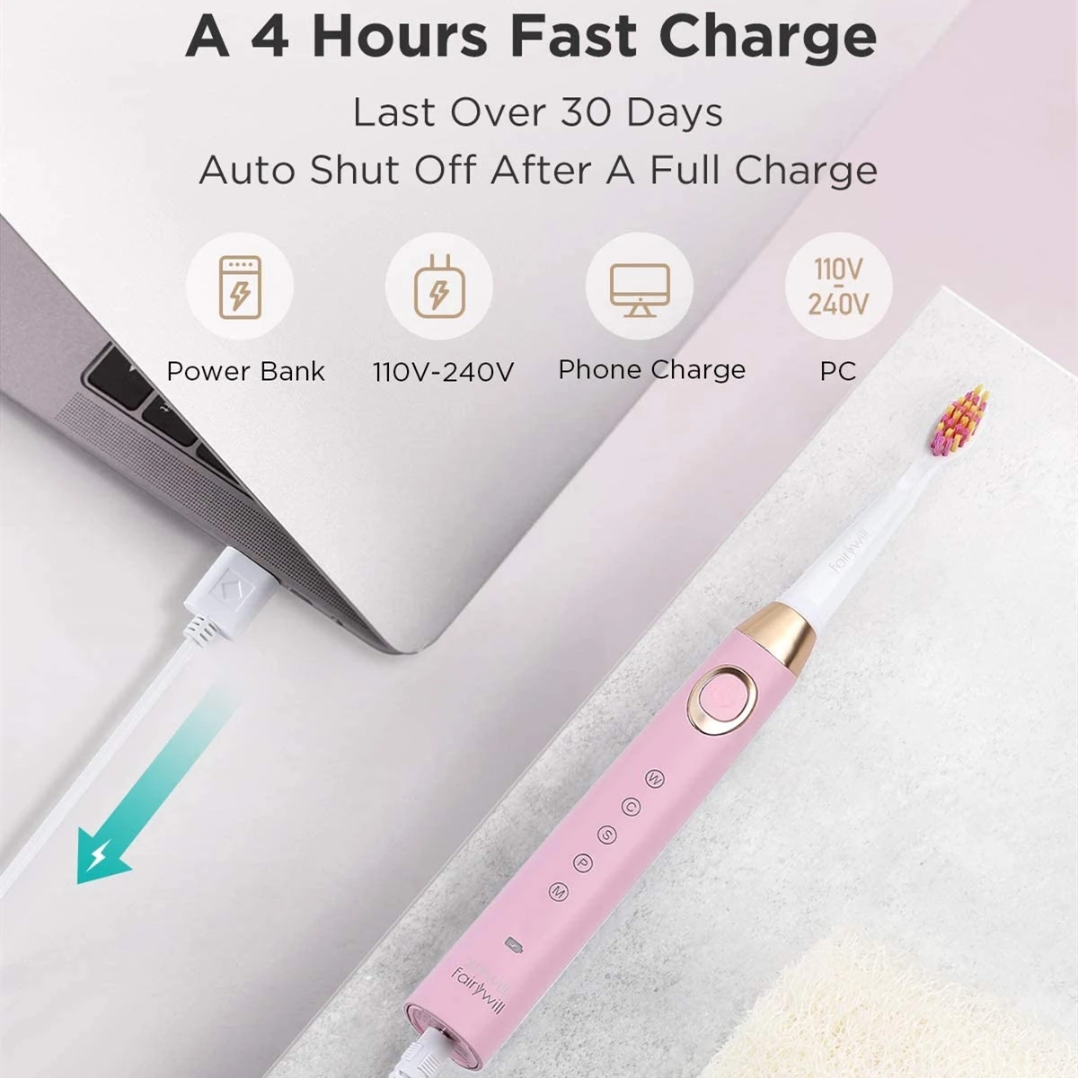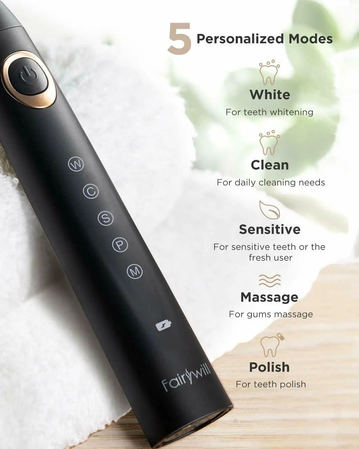 Зубная щетка Fairywill электрическая, водонепроницаемая, с чехлом, 5 режимов